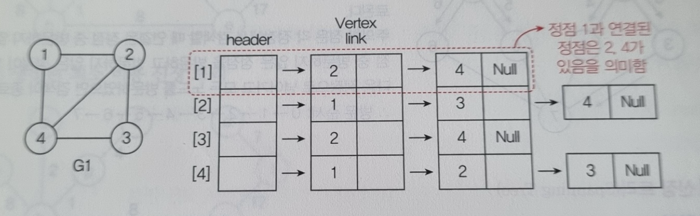 각 정점의 차수만큼 노드를 연결, 인접 리스트의 각 노드, 정점의 헤드 노드