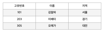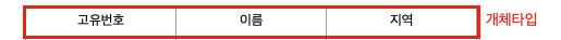 각각의 데이터 필드 (고유번호 , 이름 , 지역 )