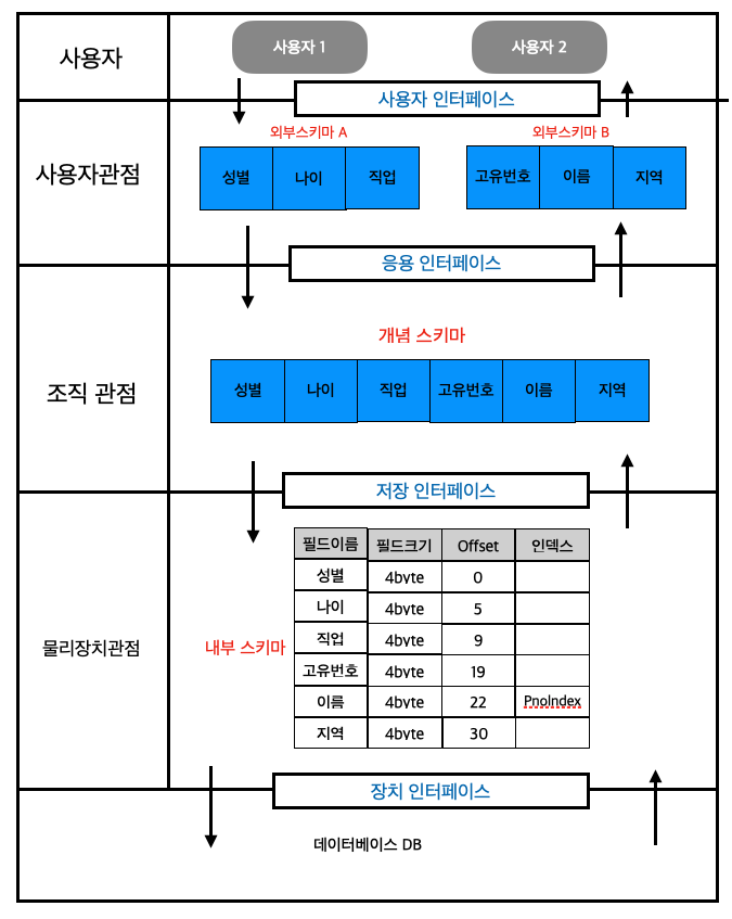 - 일반 사용자와 프로그래머 측면의 데이터베이스를 정의한 구조
