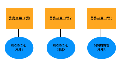 - 1개의 응용프로그램이 1개의 데이터 파일을 요구하므로 각각 응용프로그램 별로 관리해야한다