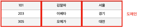 - 도메인 : 속성이 가질수 있는 값의 집합이나 범위