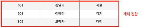 - 개체 타입 : 개체를 구성하는 속성들의 집합 ; 표의 제목