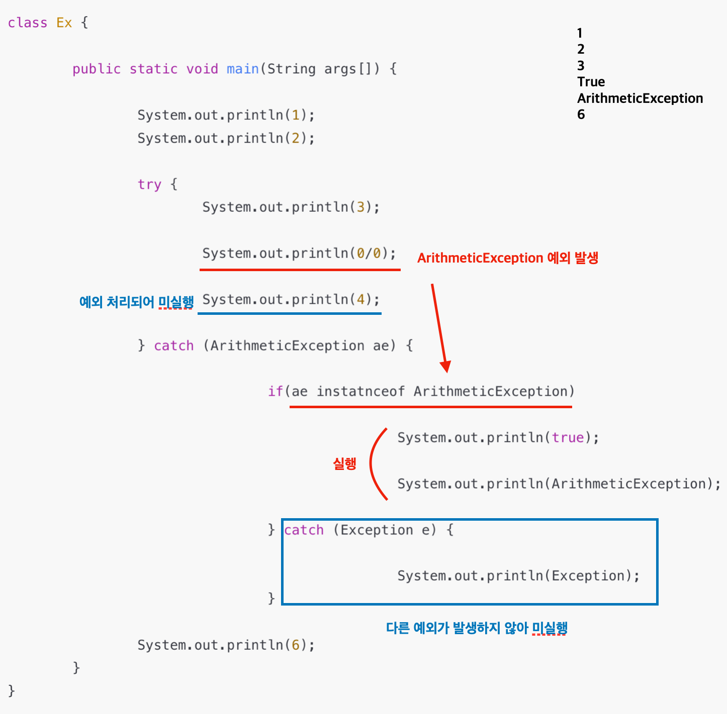 검사결과가 true가 된 catch 블럭을 찾으면 예외처리를 수행한 후에 catch문을 빠져나가고