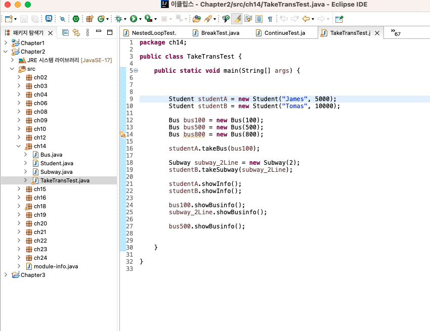 프로그램을 수행하는 수행 클래스에서 실제 실행되어 각 변수가 어떻게 실행되게 만들건지 작업한다