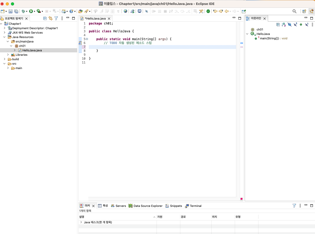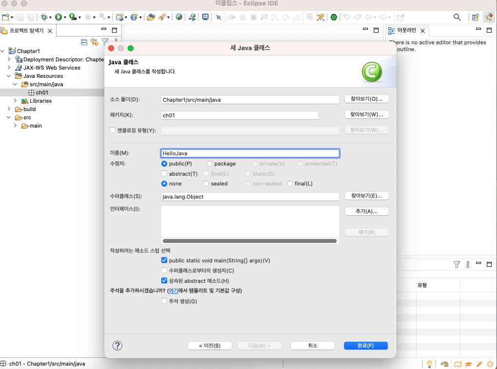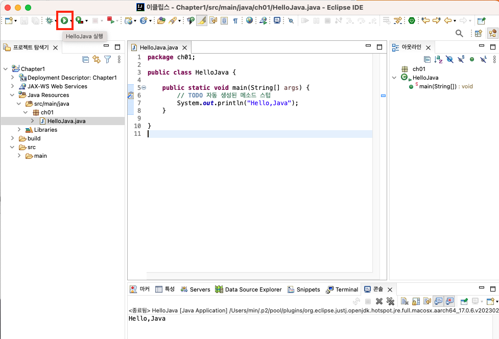 package ch01 > HelloJava 클래스 파일을 명시