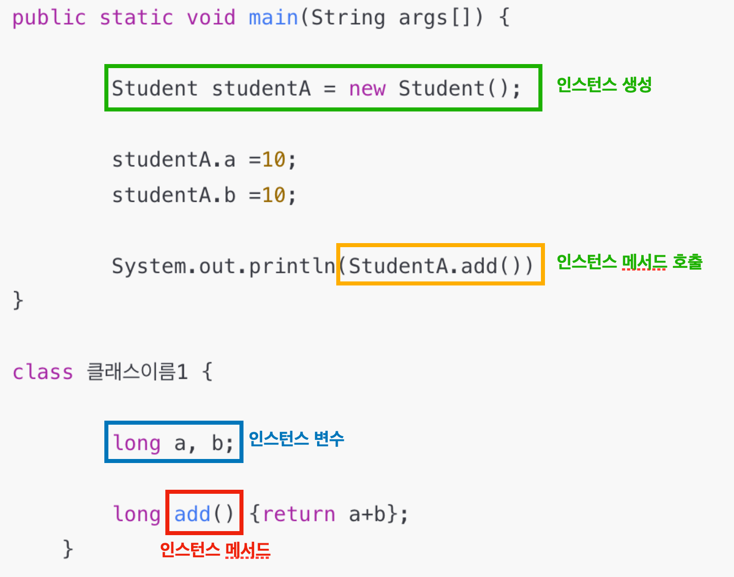 - 인스턴스 : 클래스로부터 만들어진 객체