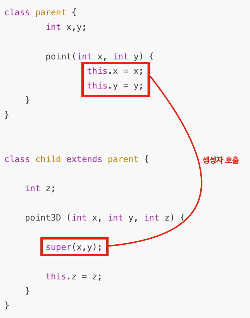- 하위클래스의 생성자는 상위 클래스의 생성자를 호출한다. 왜냐하면 하위클래스는 상위클래스의 속성을 받았기 때문에