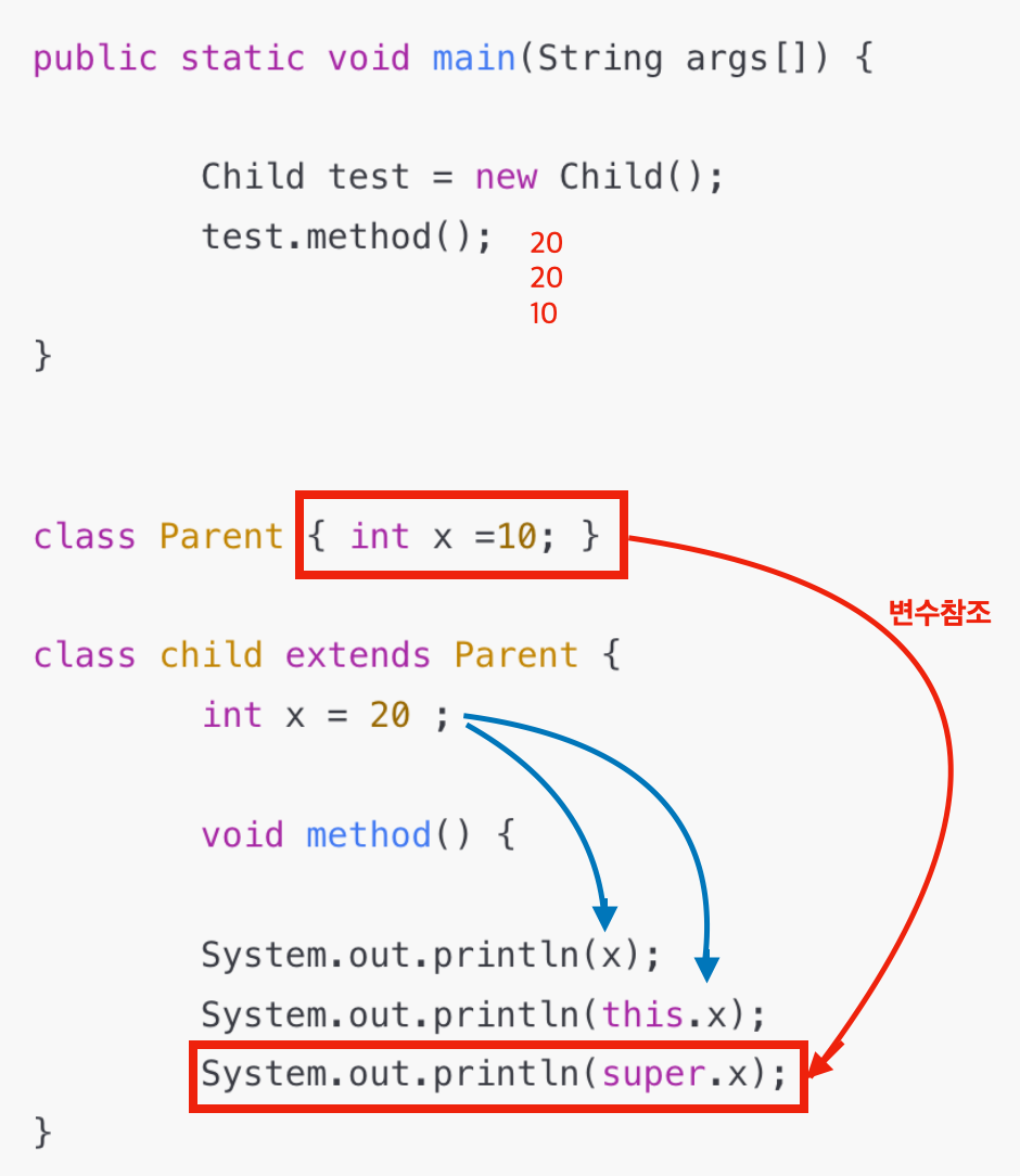 - 만약에 x의 값이 같다면 this.x 와 super.x 의 값은 같다