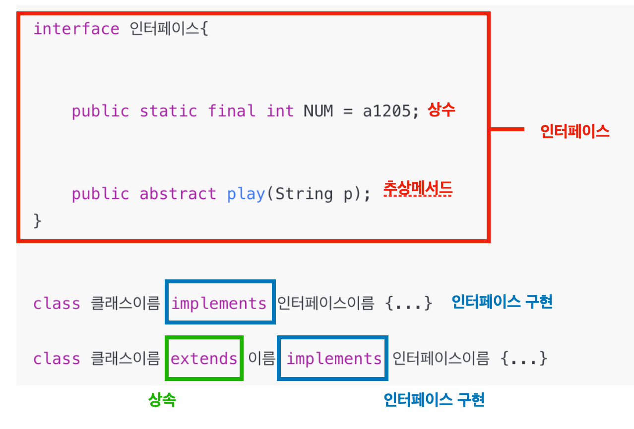 - 인터페이스는 기본설계도, 추상클래스는 미완성 설계도 이다