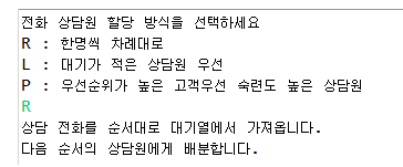 System.out.println("전화 상담원 할당 방식을 선택하세요");