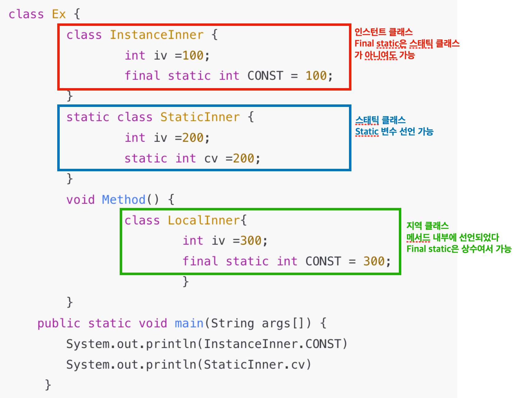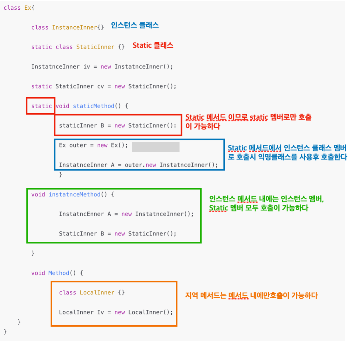 | 스태틱 클래스 static class | outer클래스의 멤버변수 선언위치에 선언한다 외부클래스의 static 멤버, 메서드에서 사용된다 static클래스만 static 멤버를 가질수 있다 static 선언을 해야한다면 스태틱 클래스로 선언한다 |