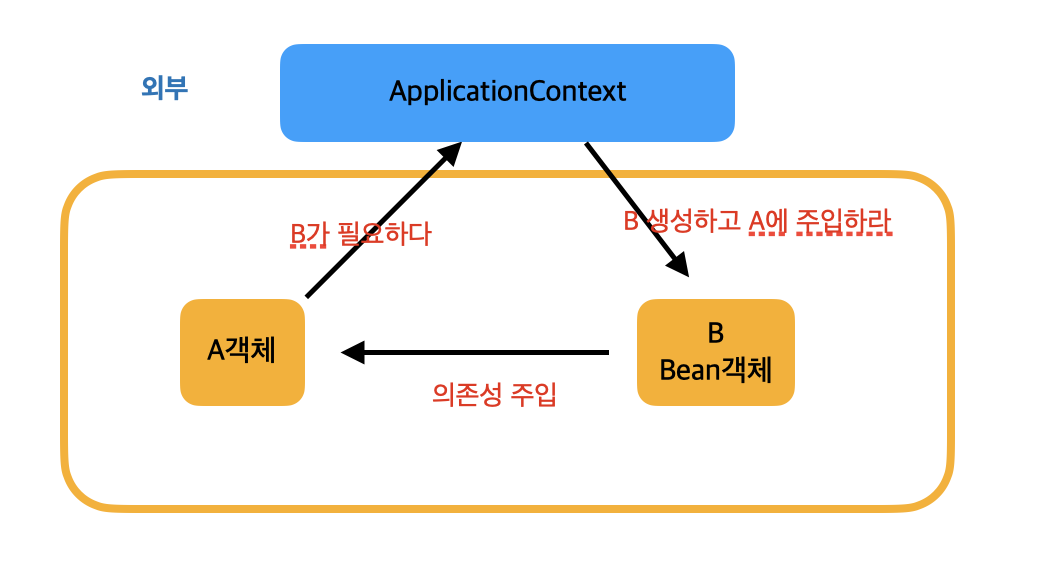 어떤 객체A가 필요한 객체B를 외부에 있는 ApplicationContext가 밀어 넣는다