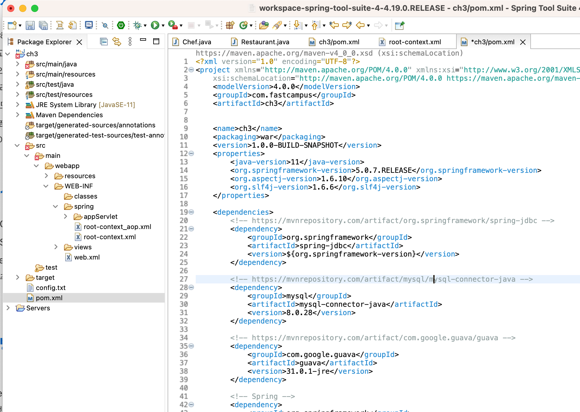 ① pom.xml 설정파일에서 아래 내용을 추가 및 수정한다