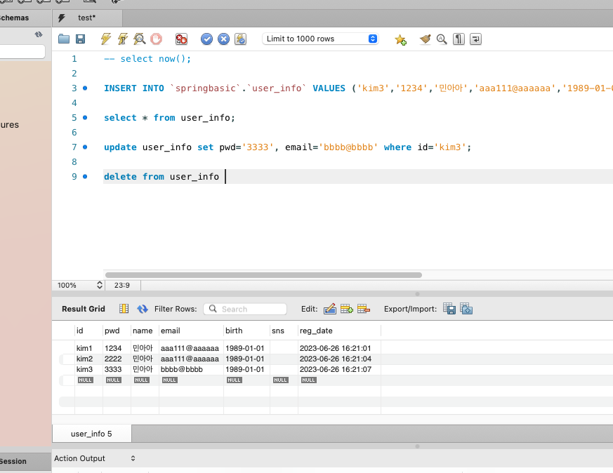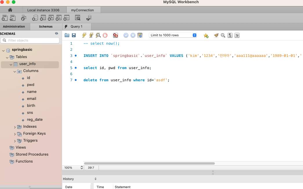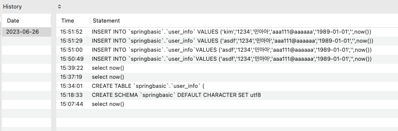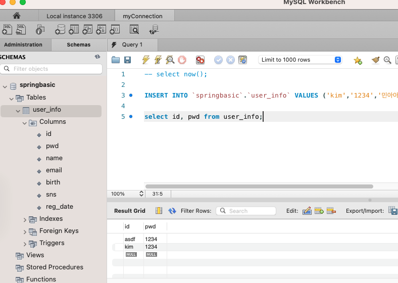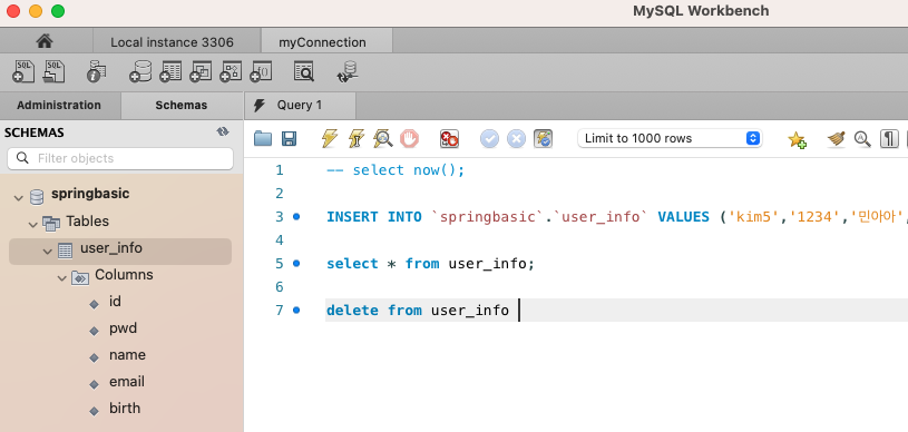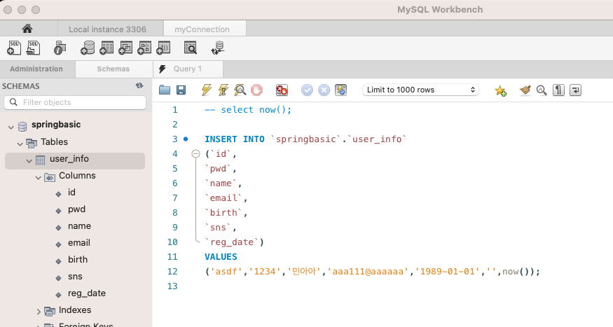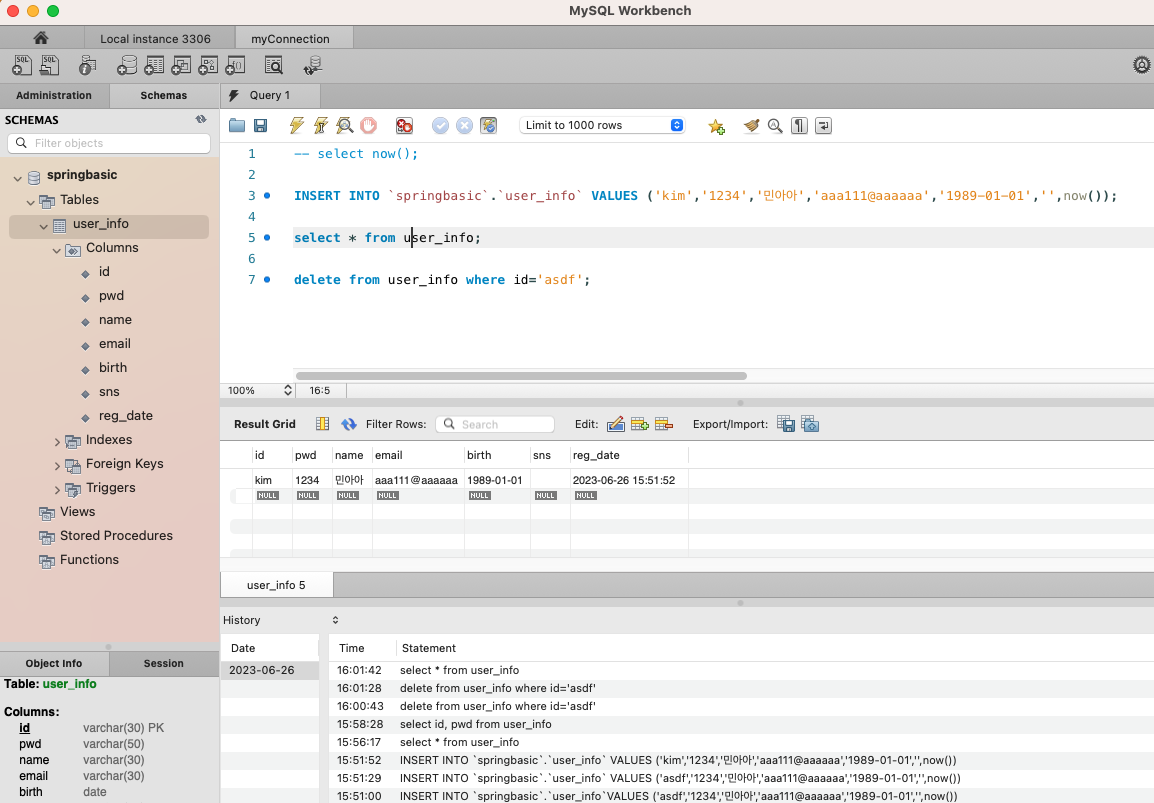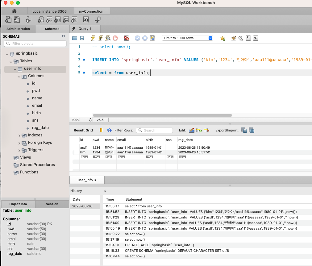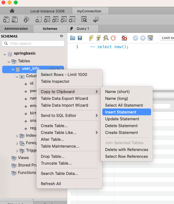 자동insert문은 user_info >Copy to Clipboard > Insert Statement 선택한다