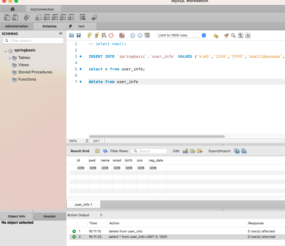 삭제 후 재조회하니 데이터값이 없어진것을 확인했다