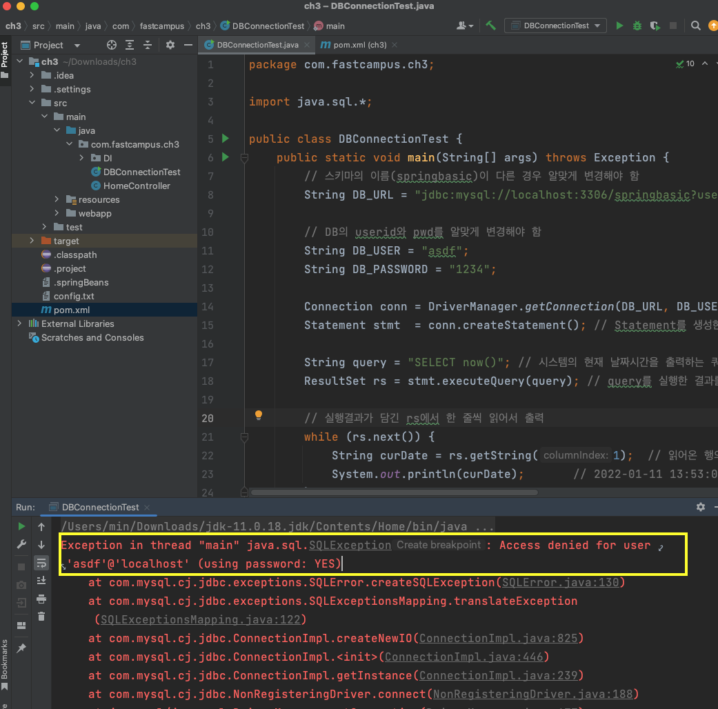 DB 연결을 위해 스키마, 계정이름, 비번을 입력했으나
