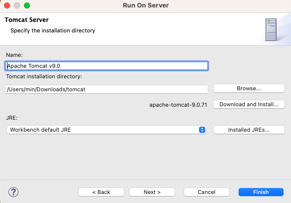 내가 톰캣 버전 9.0 설치한 파일이 있는 경로를 찾아서 폴더 선택