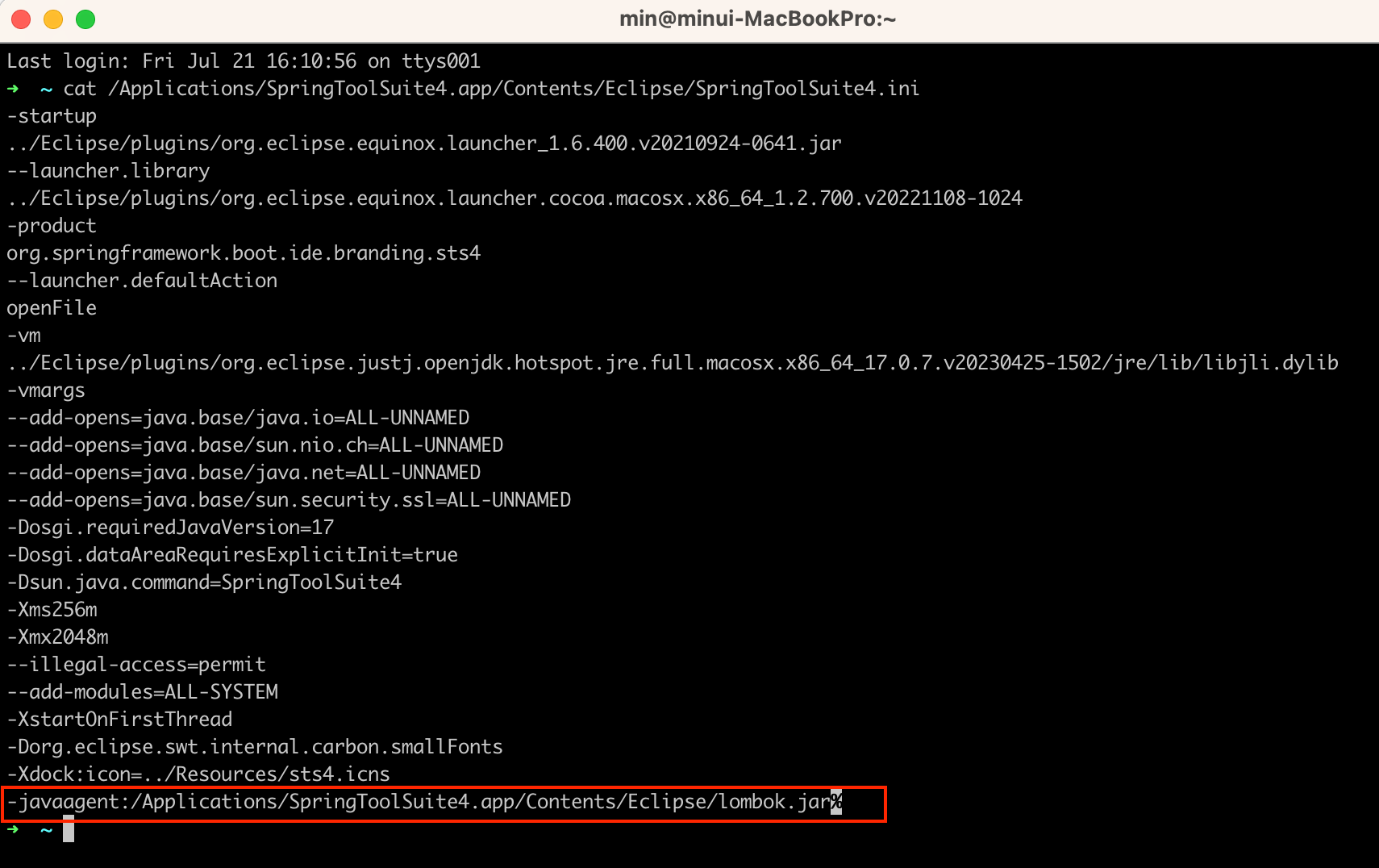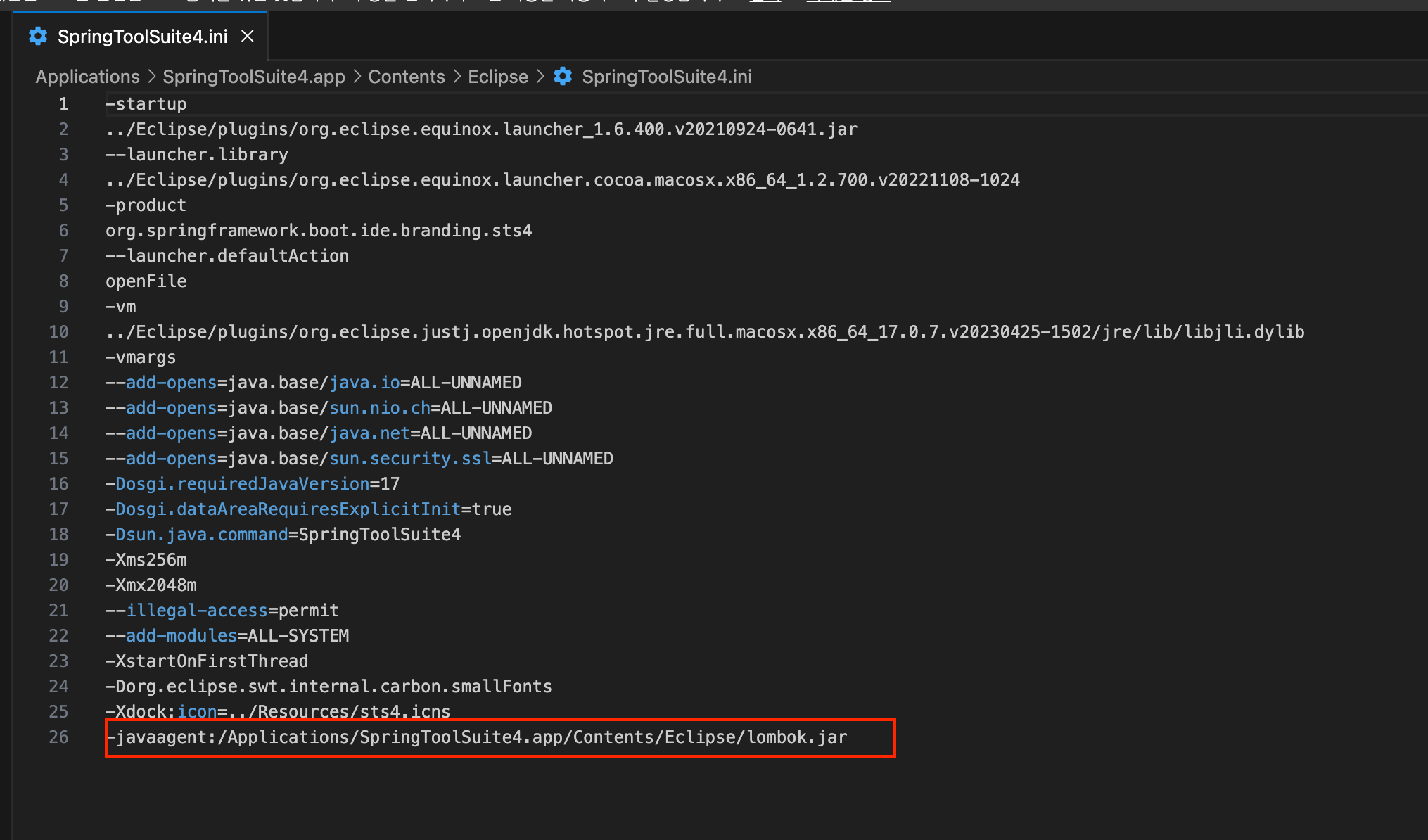 -javaagent:/Applications/SpringToolSuite4.app/Contents/Eclipse/lombok.jar