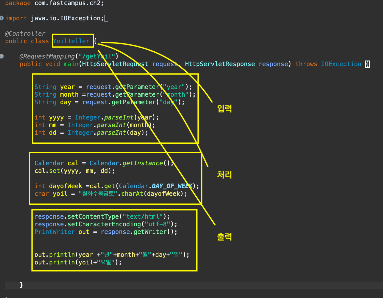 YoilTeller 라는 메서드는 내부적으로 입력, 처리, 출력의 책임 3가지를 포함하고 있기 때문에
