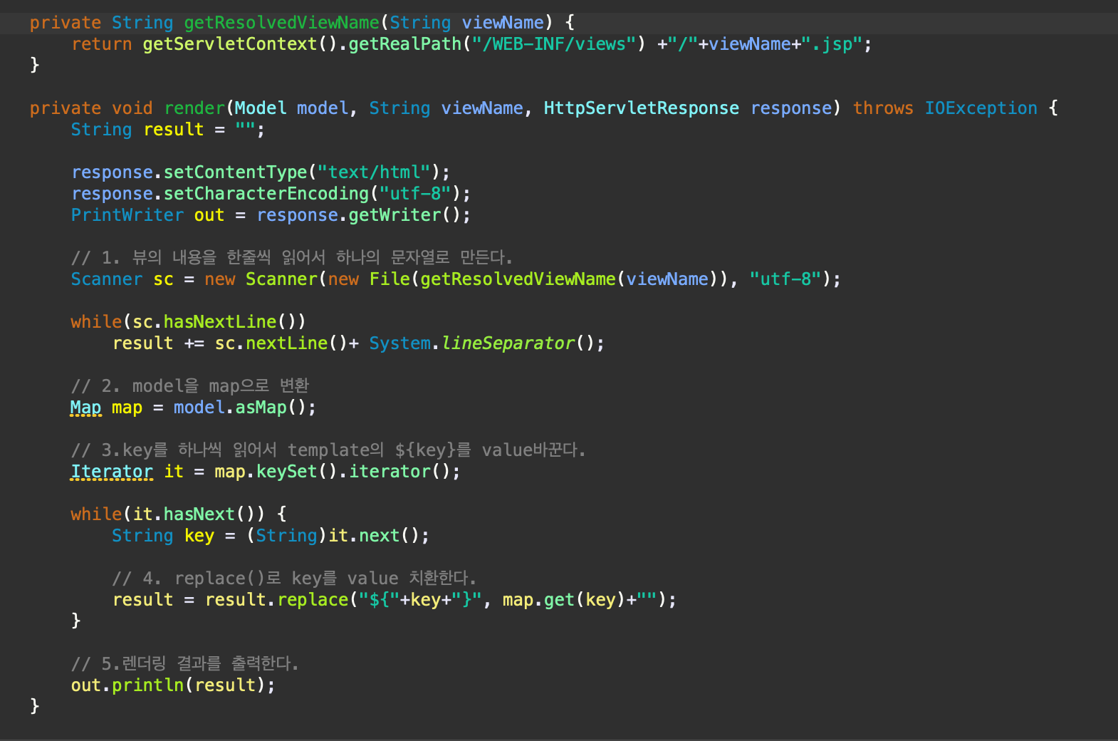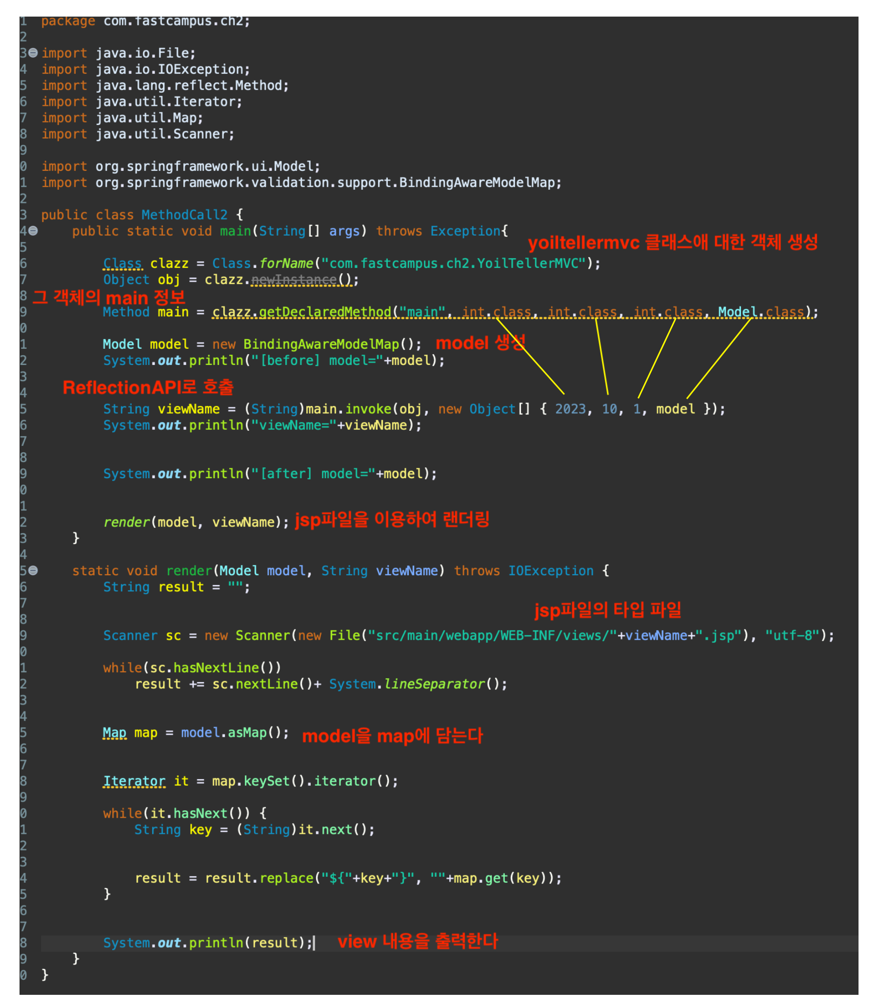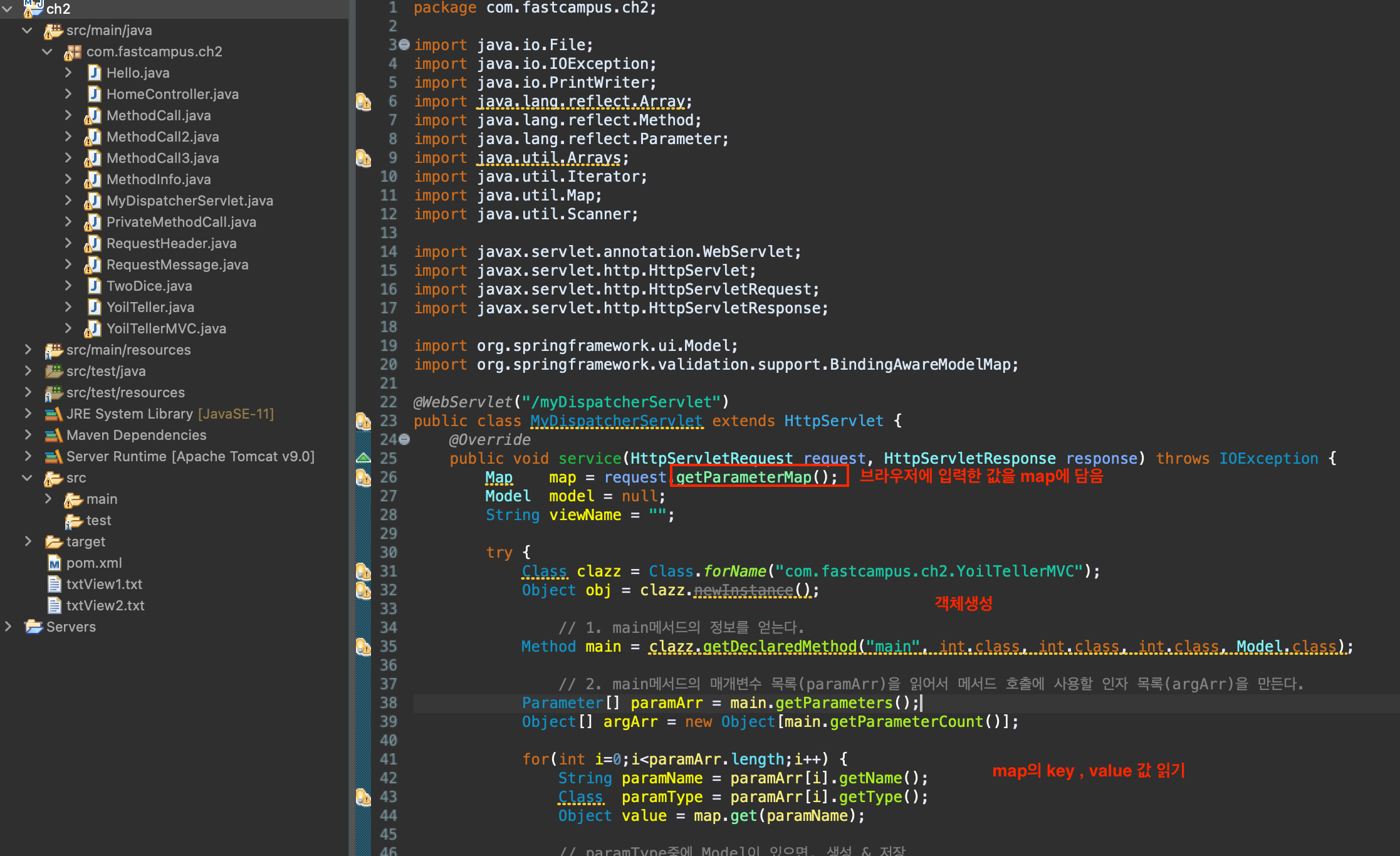 값을 동적으로 받아와서 Reflection API를 이용해서 컨트롤러를 직접 생성하고 메서드 호출한다.