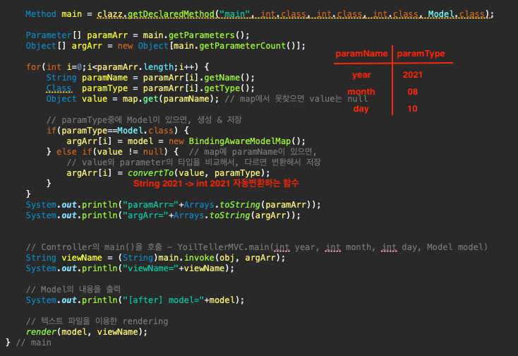 정적으로 입력된 값을 Reflection API를 이용해서 컨트롤러를 직접 생성하고 메서드 호출한다