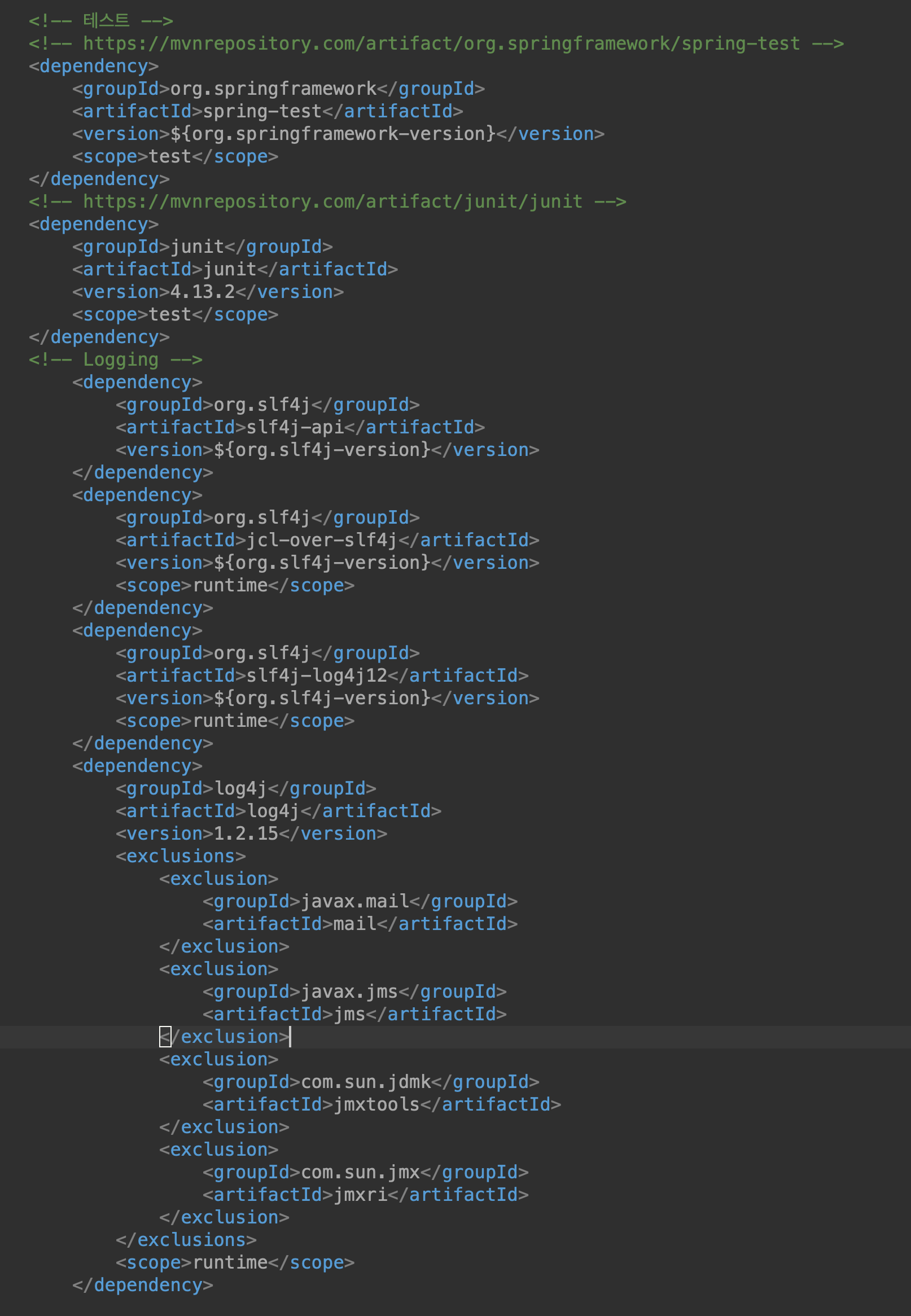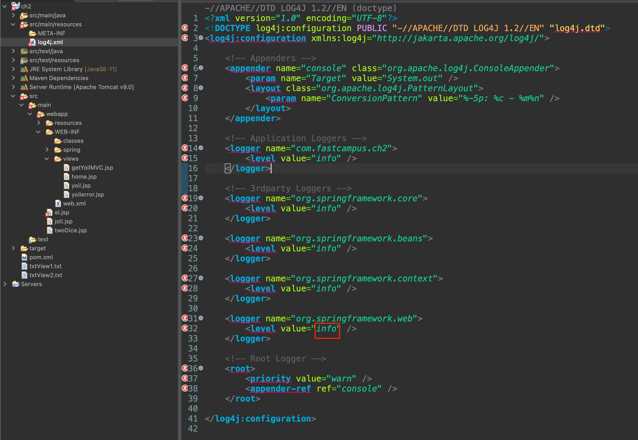 정렬이 틀어져서 계속 log4j.xml을 읽을수 없다고 오류가 날수 있다.