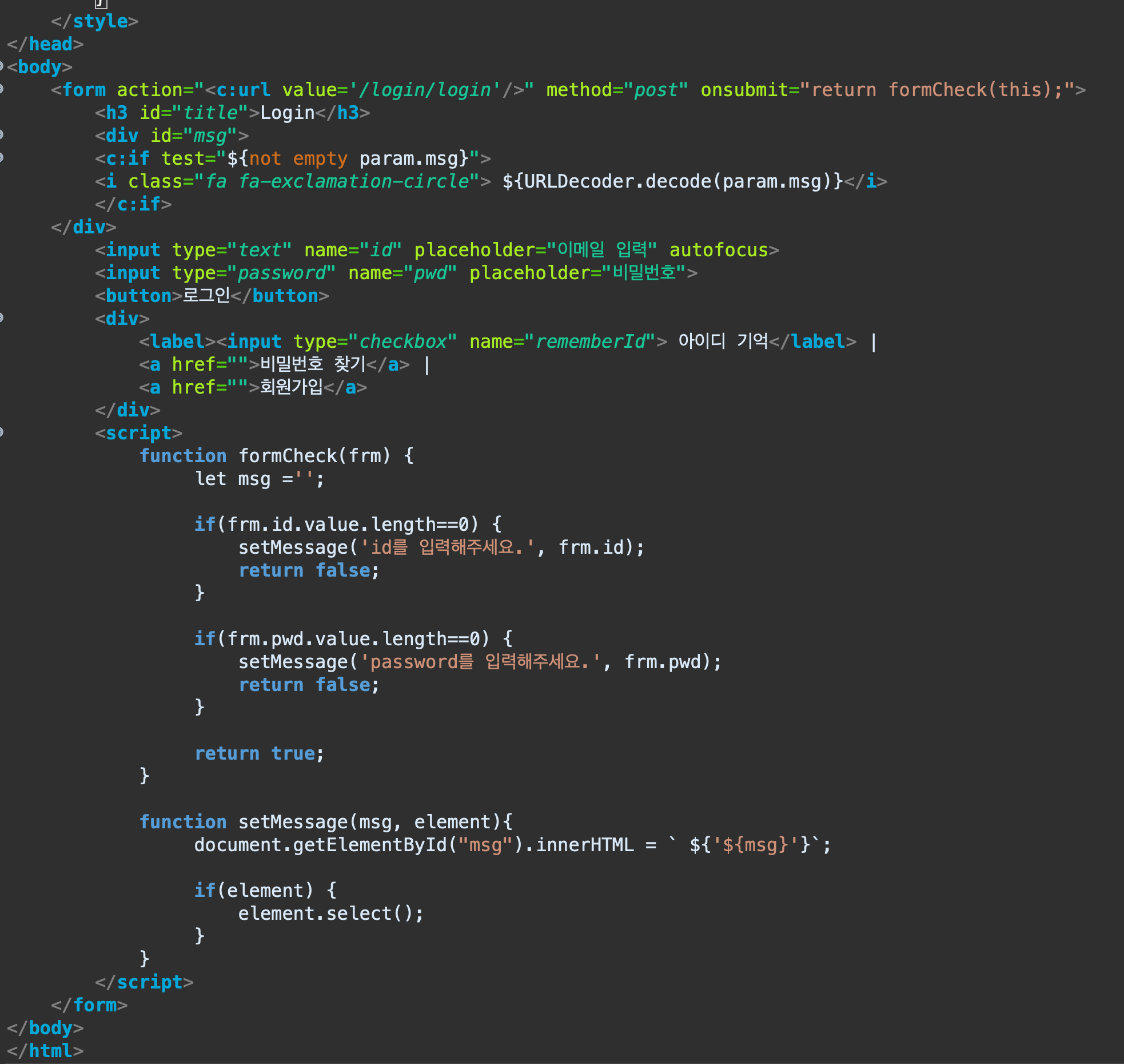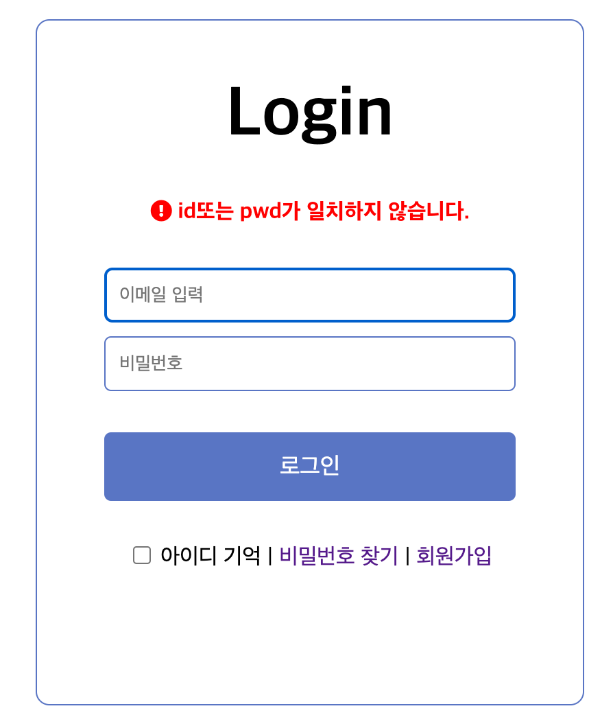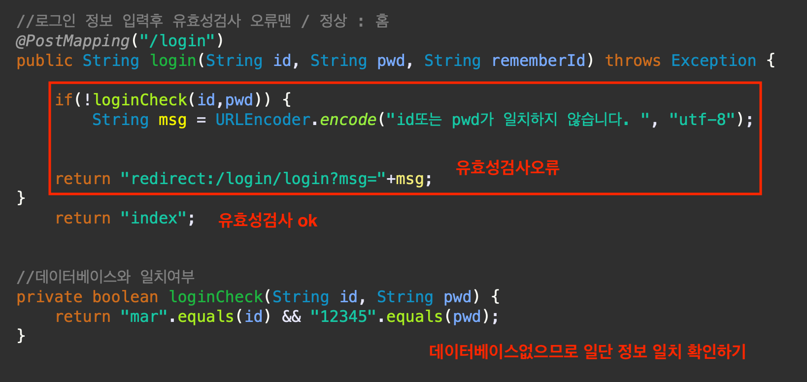현재는 데이터베이스가 없으므로 일단 임의로 id와 pwd를 일치시키게 하기 위해