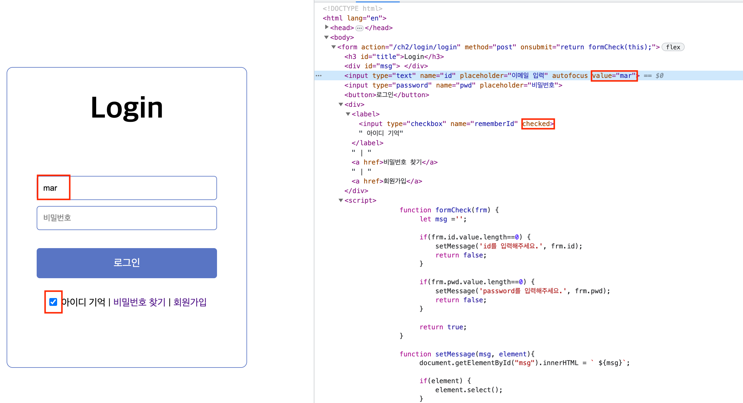 브라우저에 쿠키가 있다면 checked를 넣고 없다면 "" 빈문자열로 넣어라