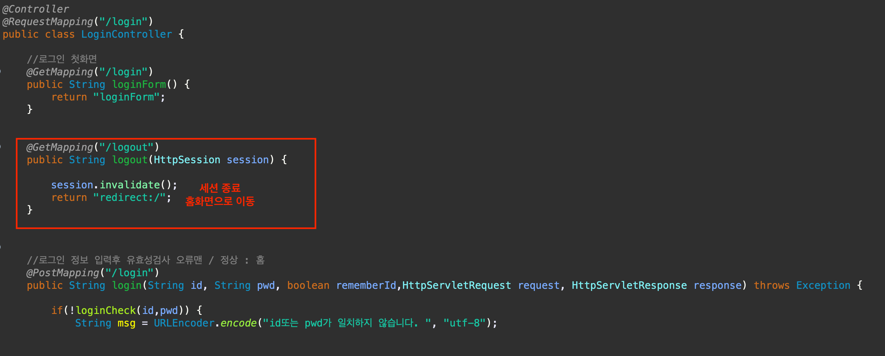 로그인 컨트롤러에 로그아웃 정보를 입력한다