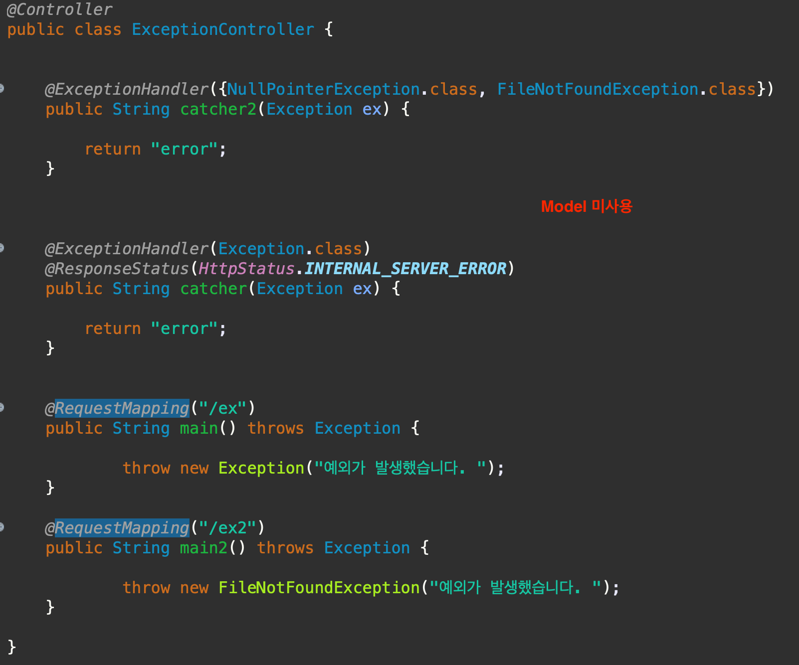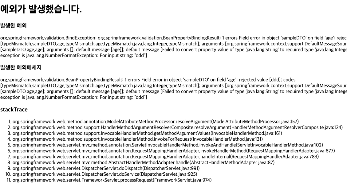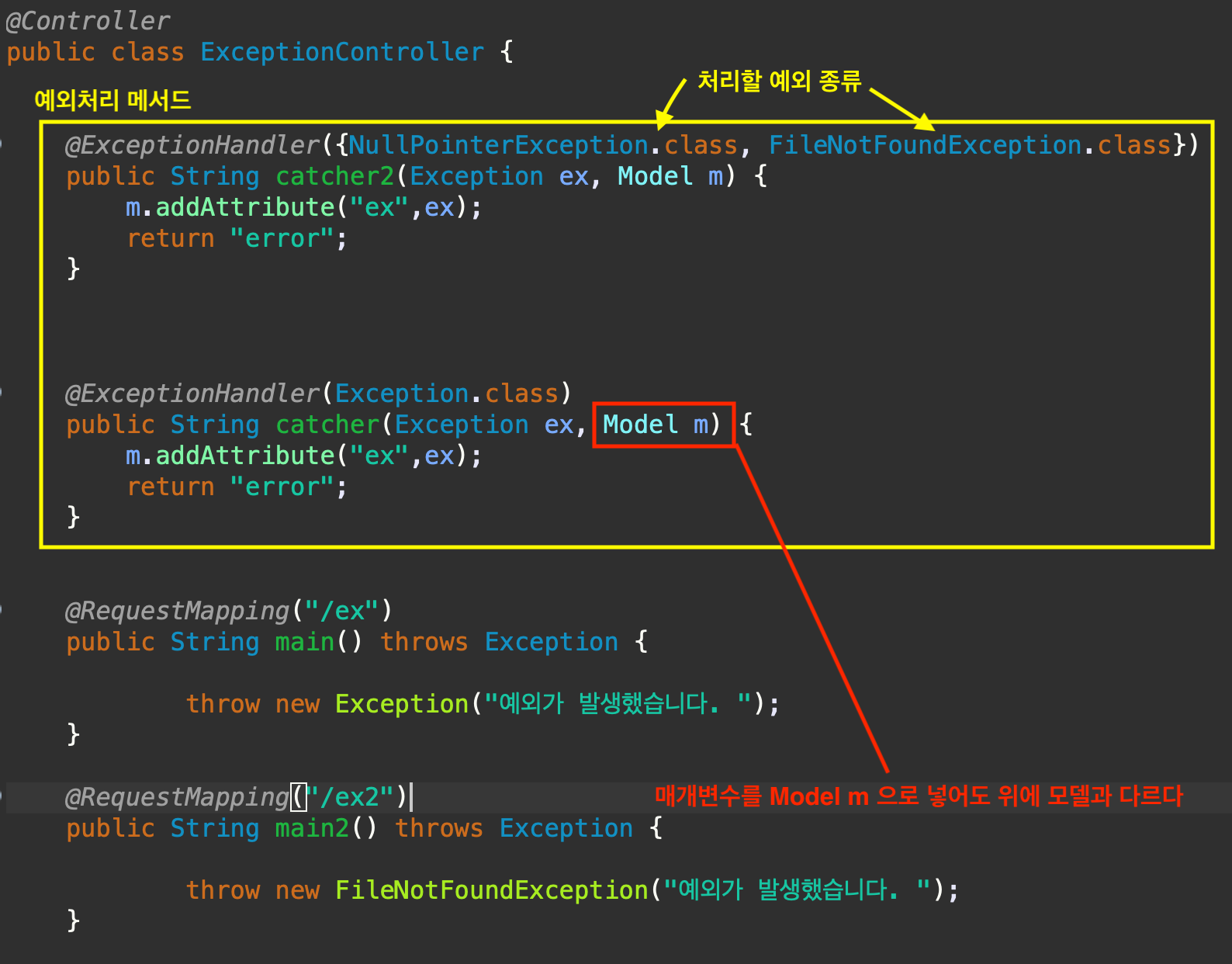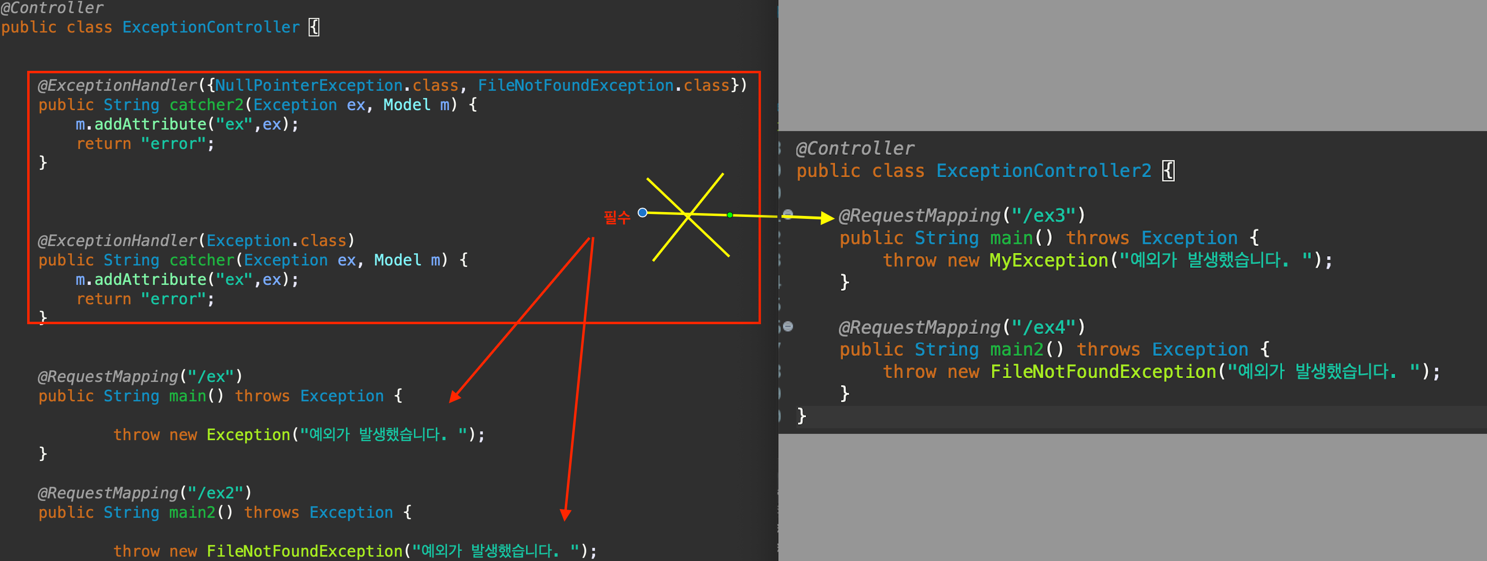 별도로 컨트롤러에 다른 내용의 예외설정을 할경우에는 @ExceptionHandler를 새로 작성한다면 그 예외 설정이 제일 가까운 내용이기 때문에 적용된다