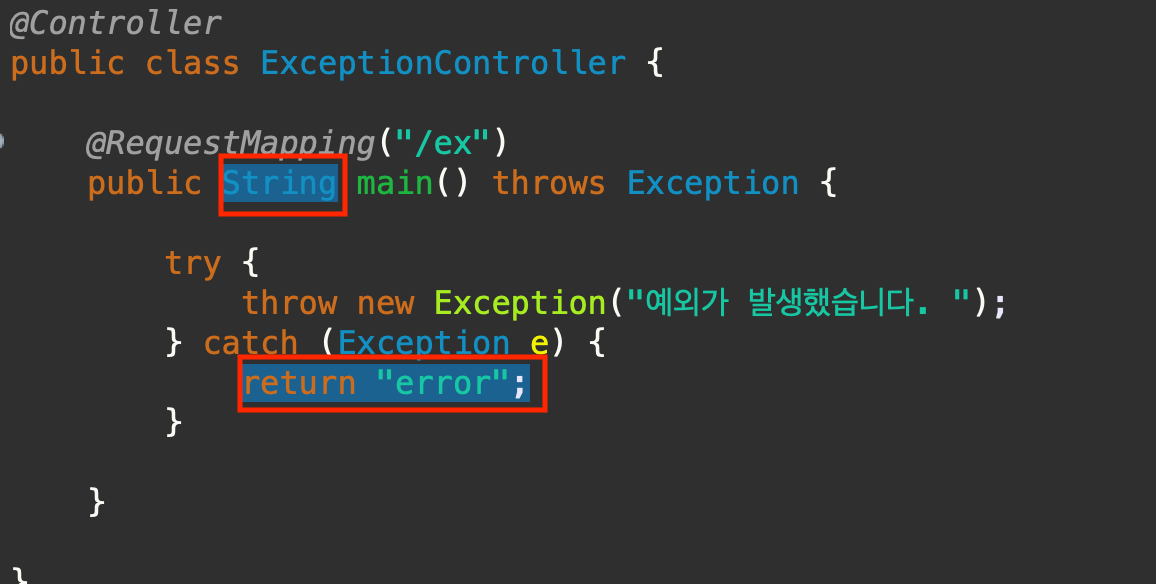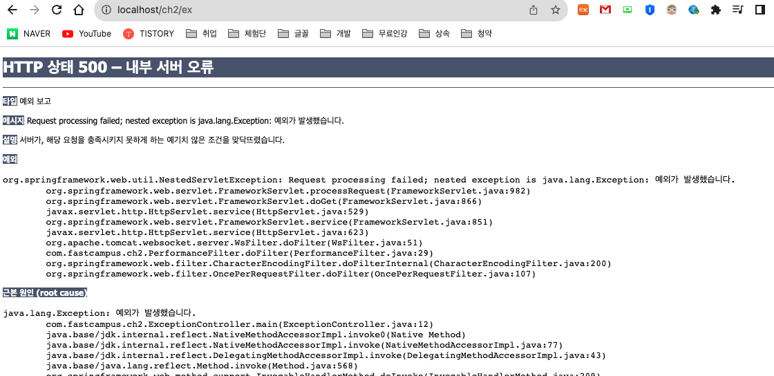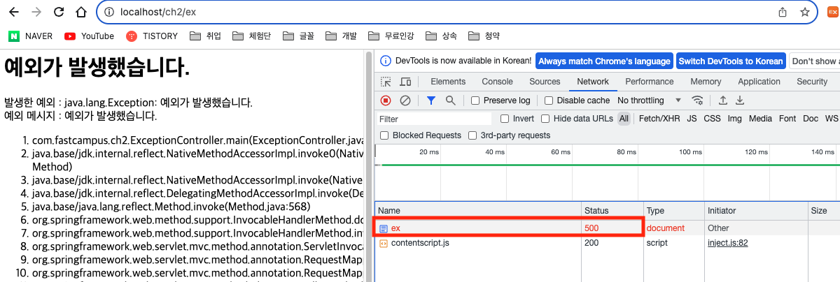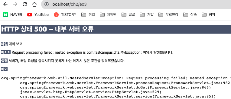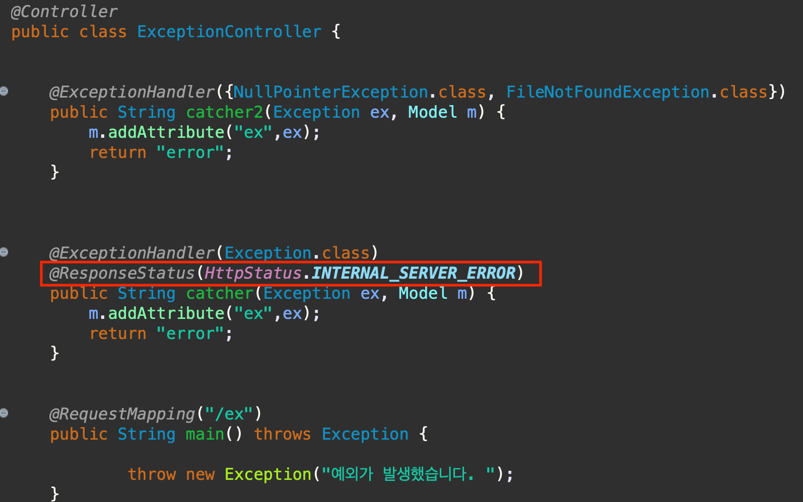 수정을 하는 이유는 컴파일시 예외가 발생시 상태코드를 500으로 하라고 설정되어있기 때문에 500이 나오나