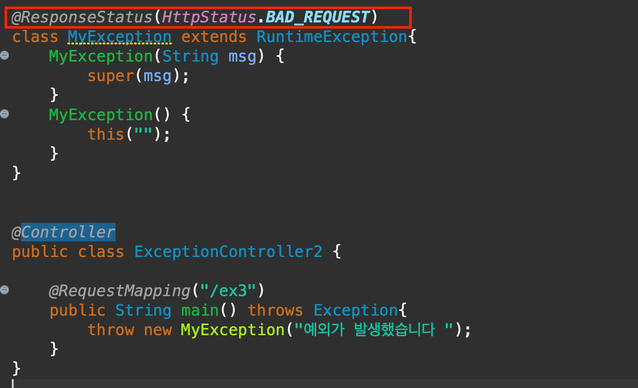 목적2 : 디폴트 상태코드가 아닌 상세코드를 제출하기 위해 사용자 정의 예외 클래스 앞에 사용한다