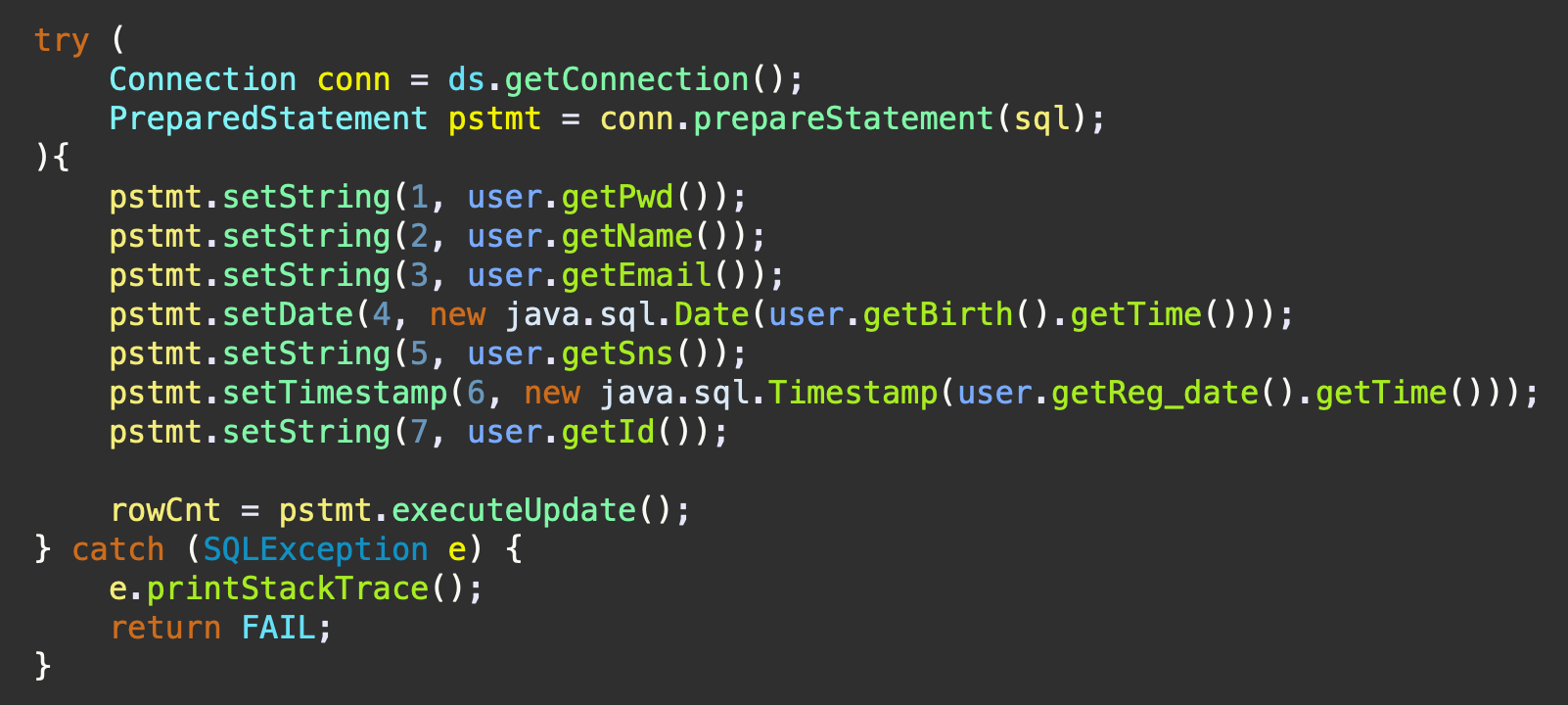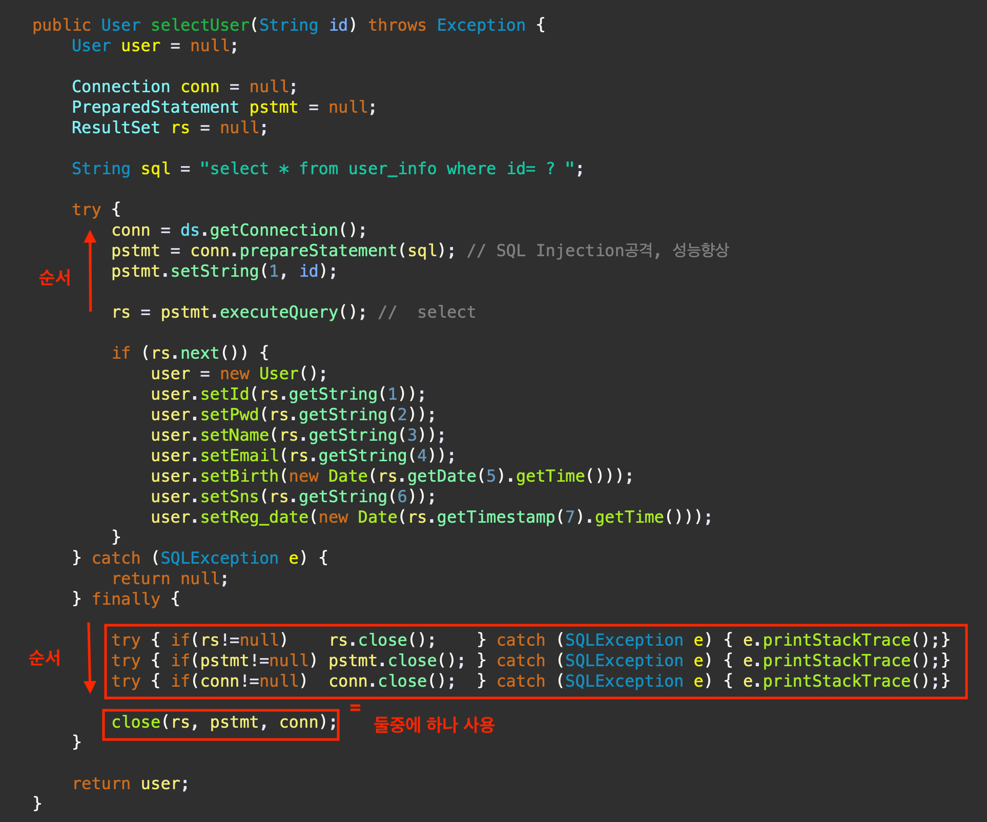 finally 와 close를 사용하지 않을것이라면 try-catch-resources 구문으로 사용한다.
