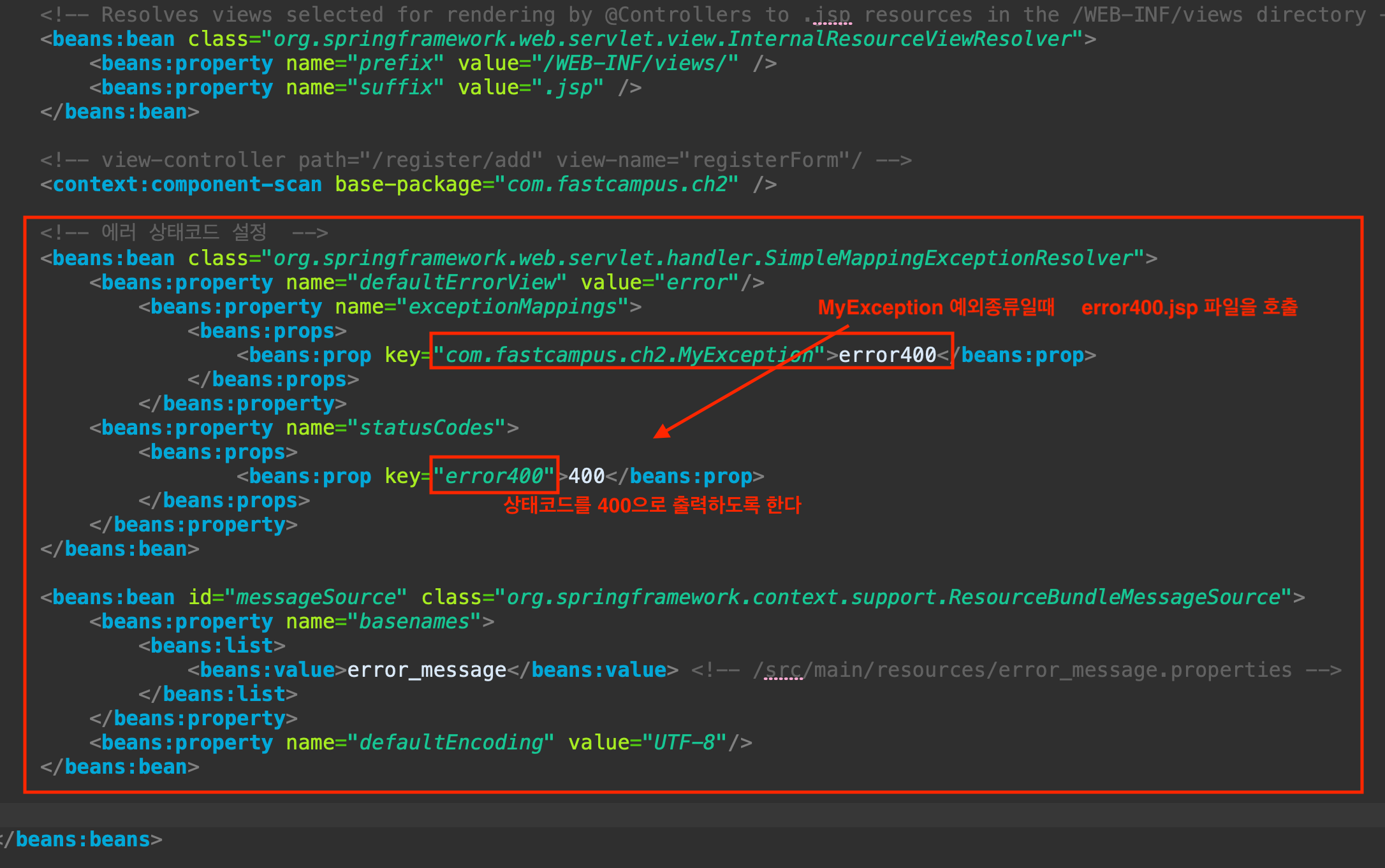 - 예외 종류별 뷰 설정 방법 SimpleMappingExceptionResolver