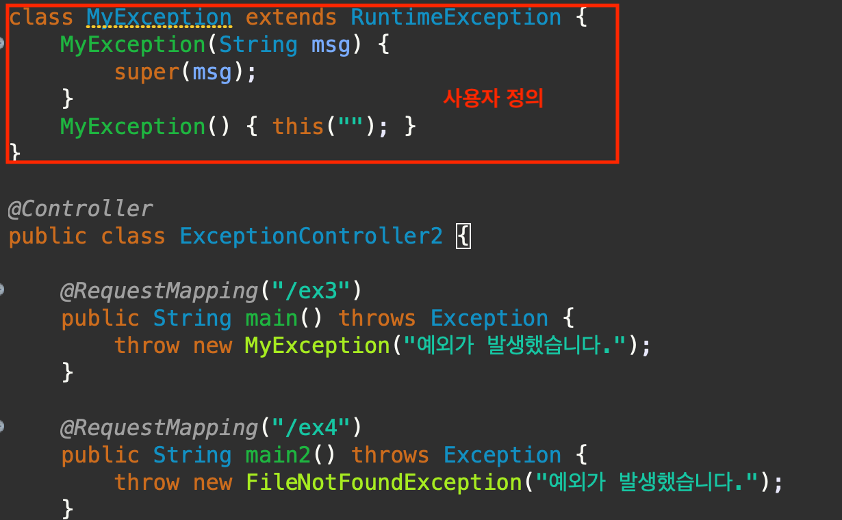 사용자 정의한 메서드 MyException 메서드를 선언하고
