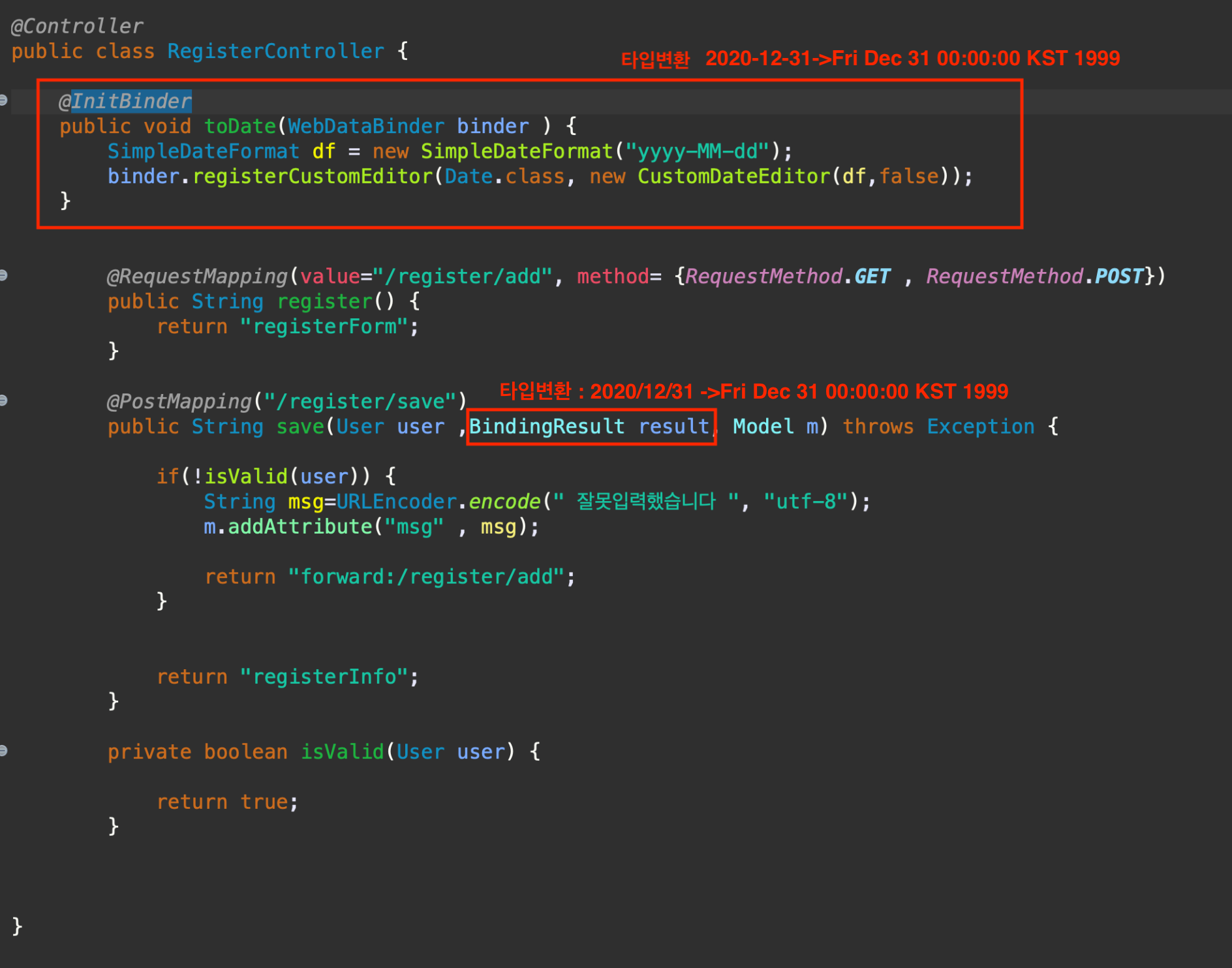String 타입 2020/12/31 에서 Date 타입으로 변환하기 위해서는 BindinResult result 를 넣으면 타입 변환이 되고