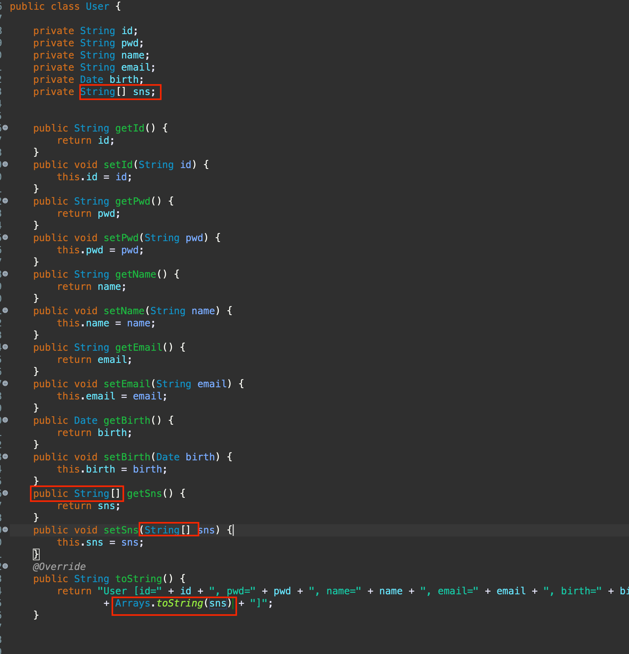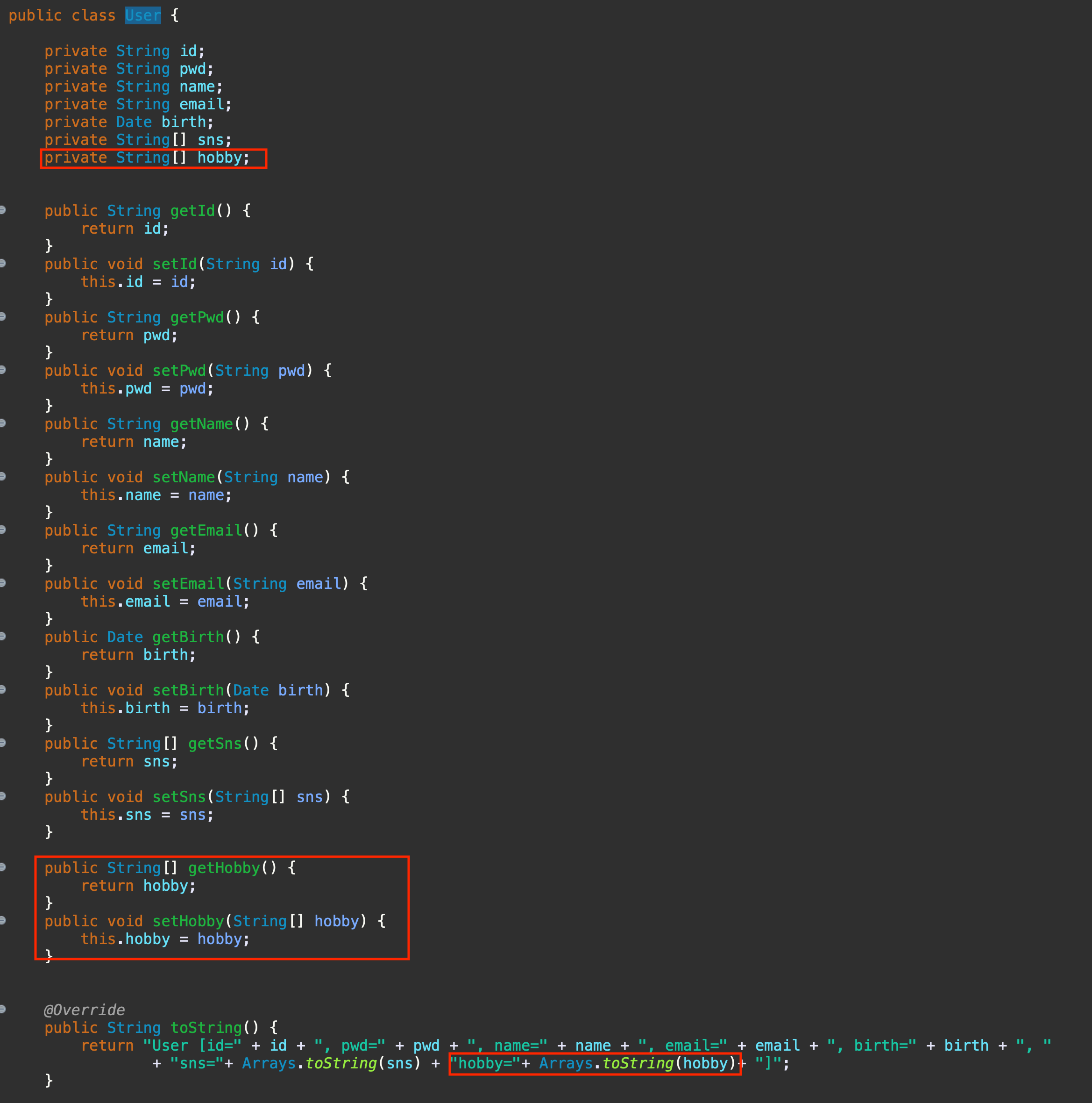 String [] hobby 변수, get& set , toString() 내용을 추가한다.