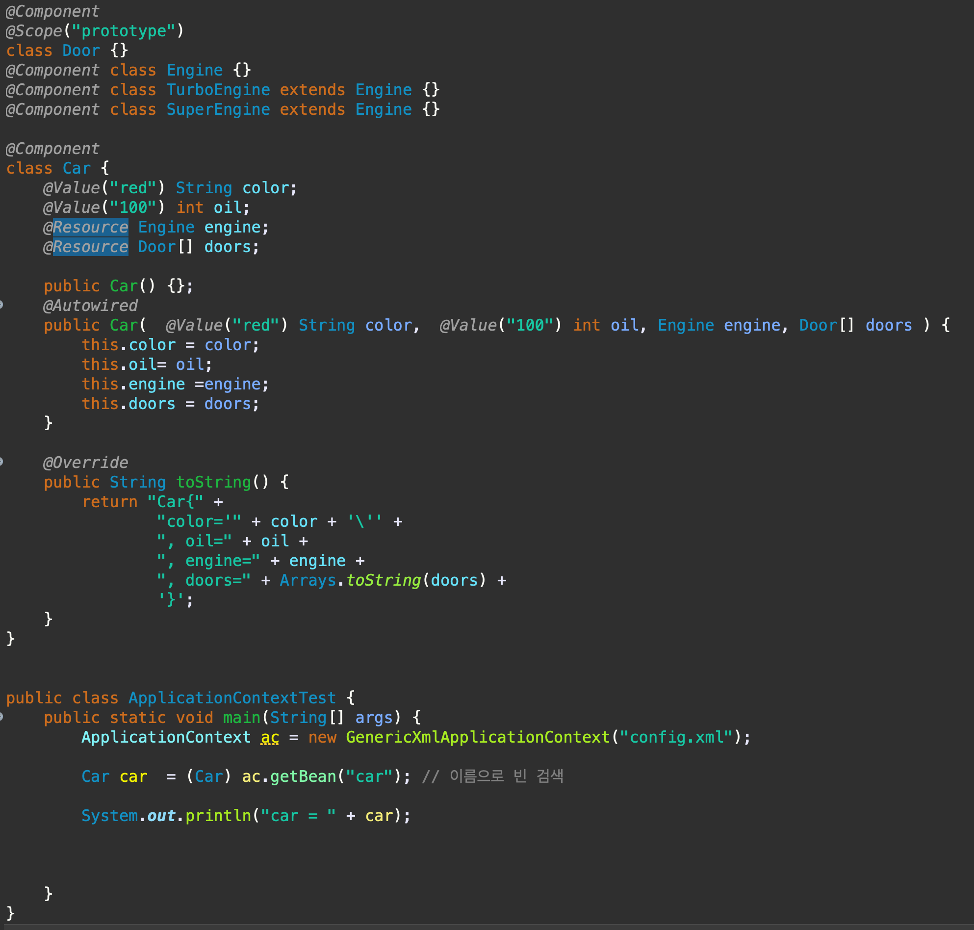 - Spring container에서 타입으로 bean을 검색해서 참조 변수에 자동으로 주입한다