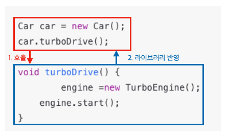 | 저장된 Bean에 접근하기 위해 컨테이너가 제공하는 API를 이용하여 Bean을 Lockup한다 | 각 클래스간의 의존관계를 Bean 설정 정보를 바탕으로 컨테이너가 자동으로 연결해준다 |