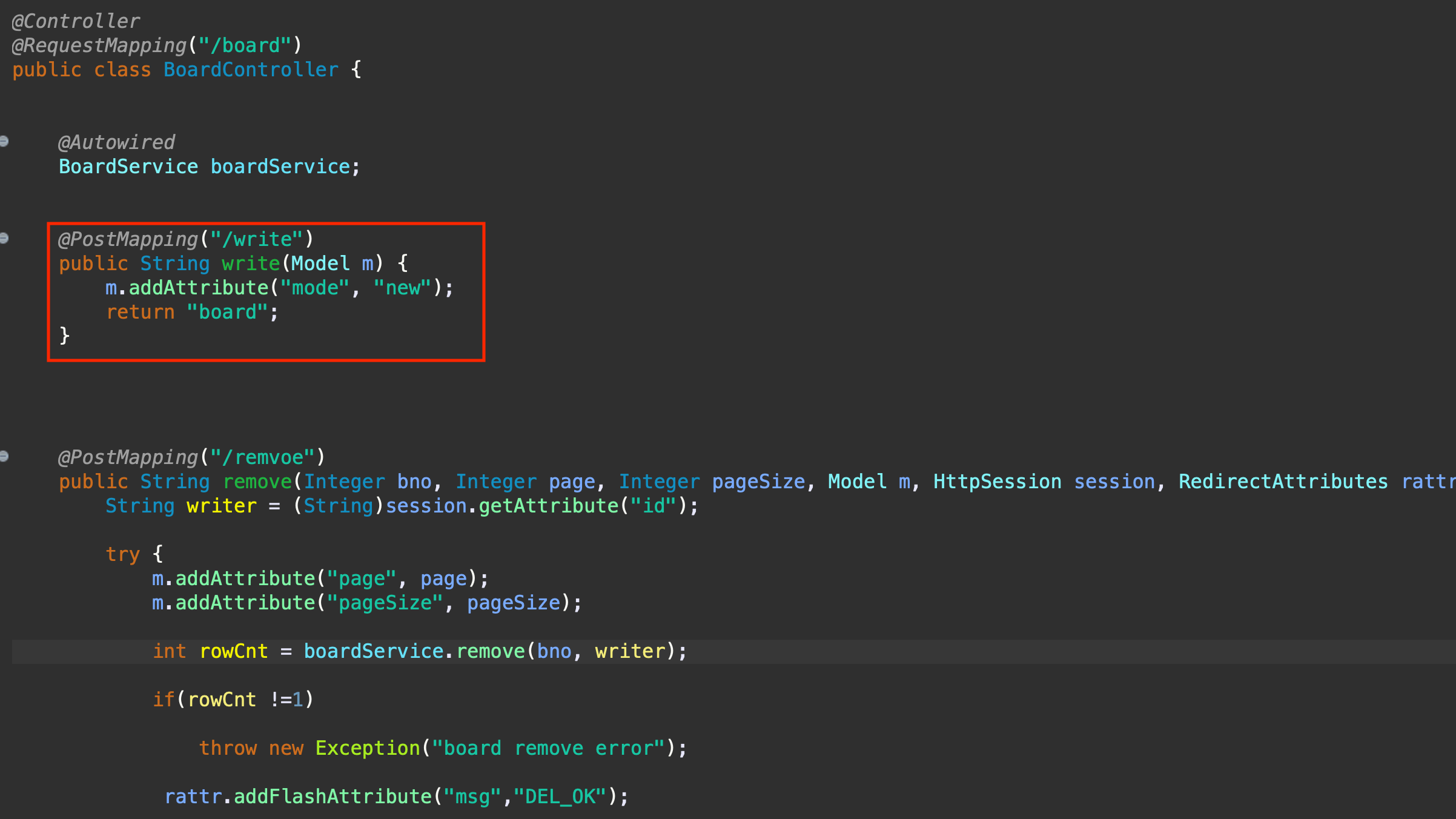 boardController 에서 write 메서드가 동작했을때 어떻게 될지 설정한다.
