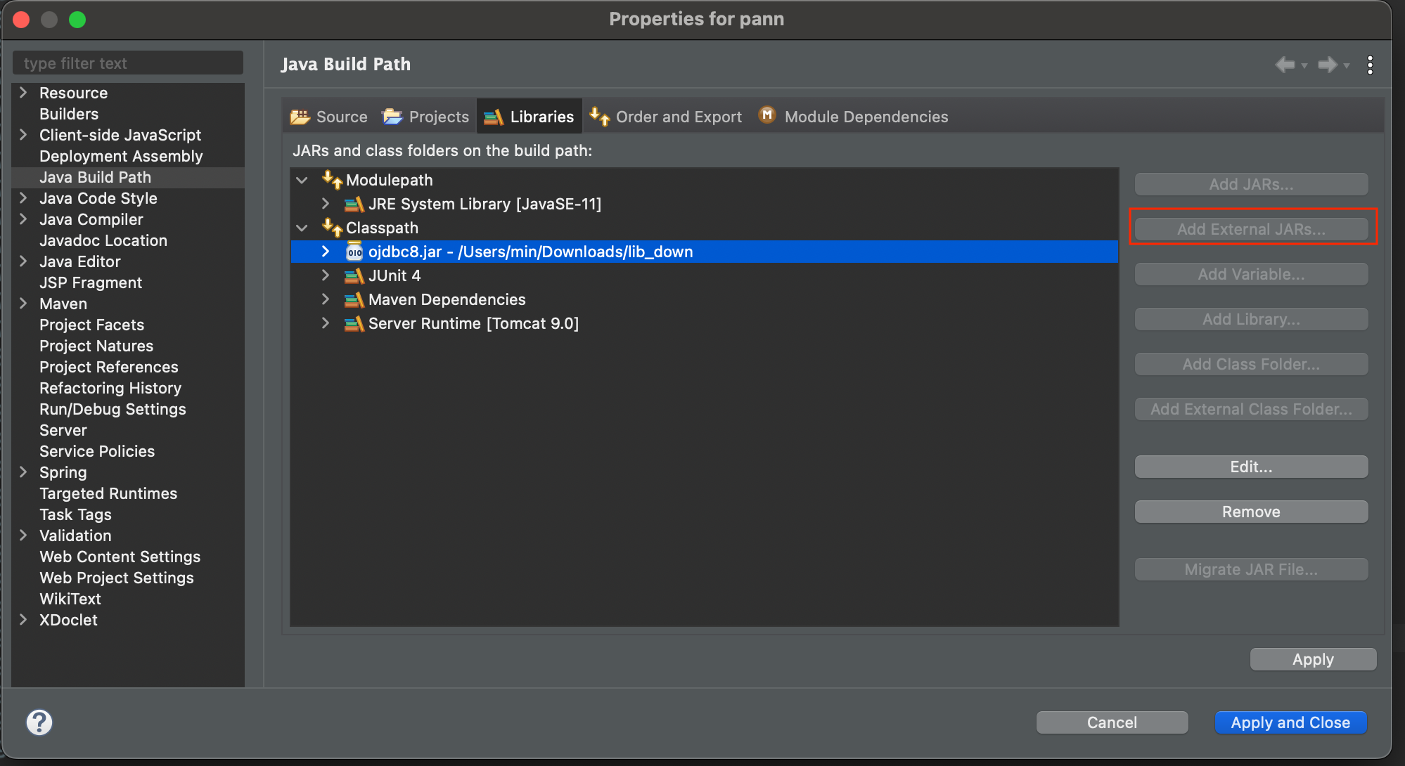 라이브러리에 다운받은 ojdbc8을 직접 추가한다