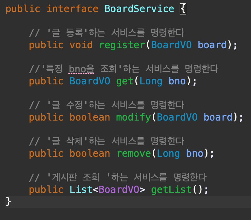 이전 앞서서 작성한 게시판 CRUD를 동작하게 만드는 서비스(명령)을 작성한다