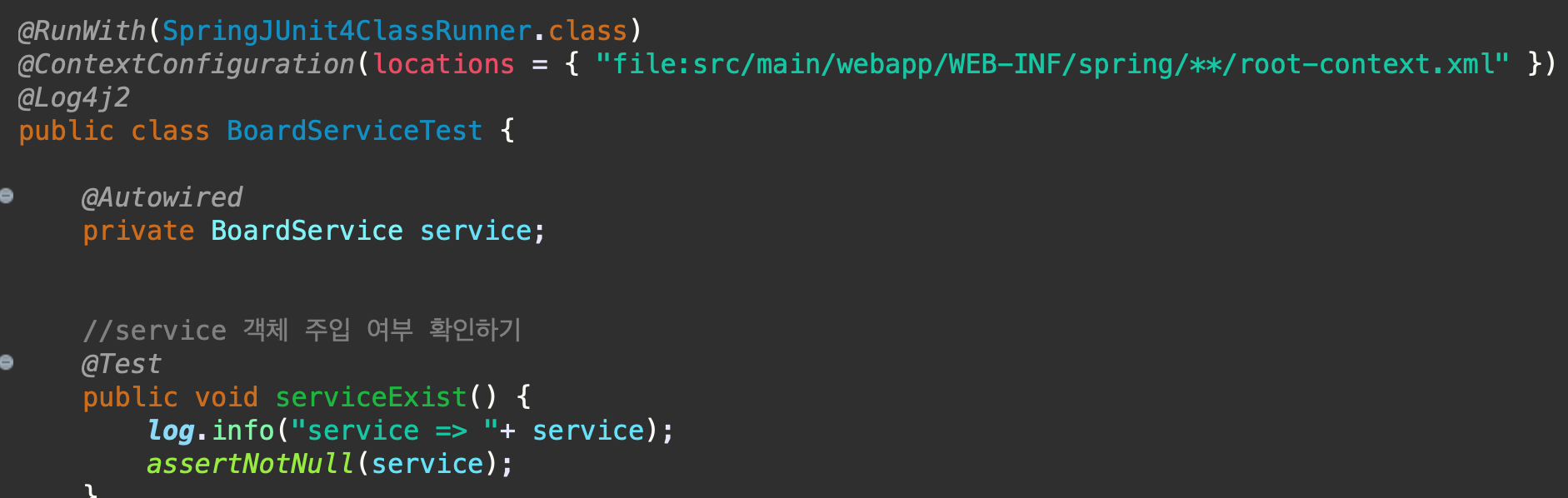 서비스가 연결되었는지 확인하기 위해 객체 주입여부 확인