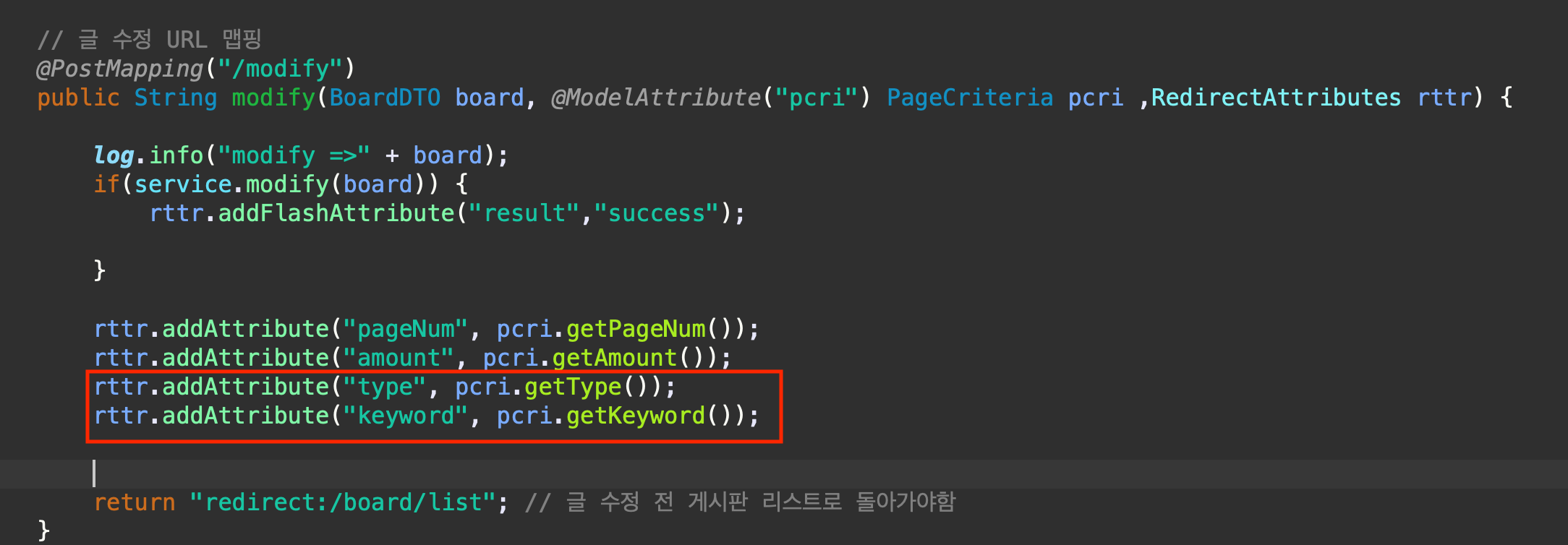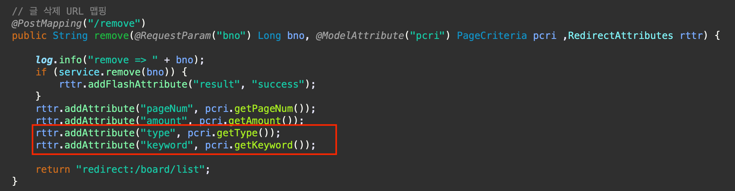 redirect: 로 동작할때는 type,keyword 조건을 추가한다