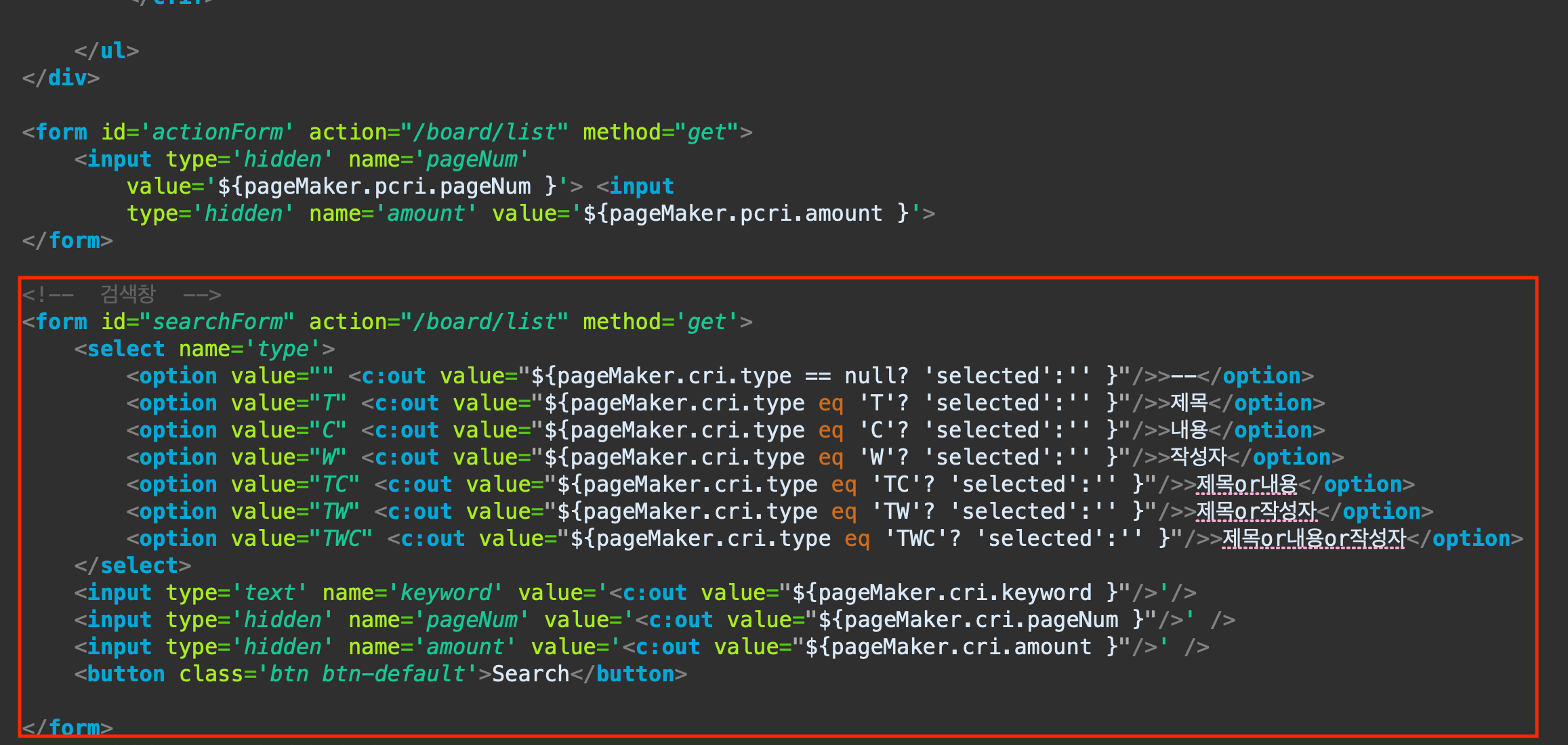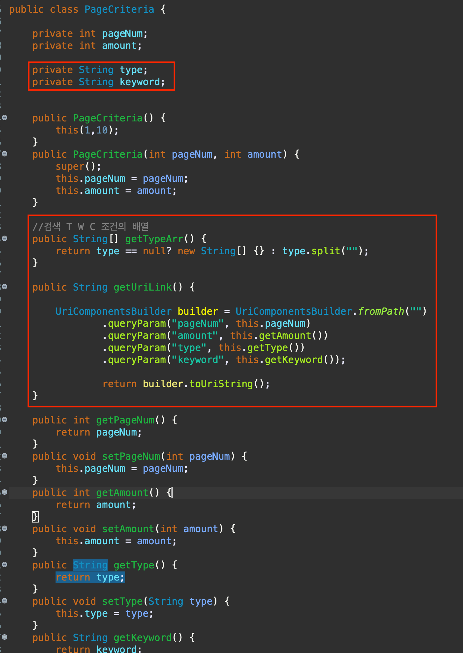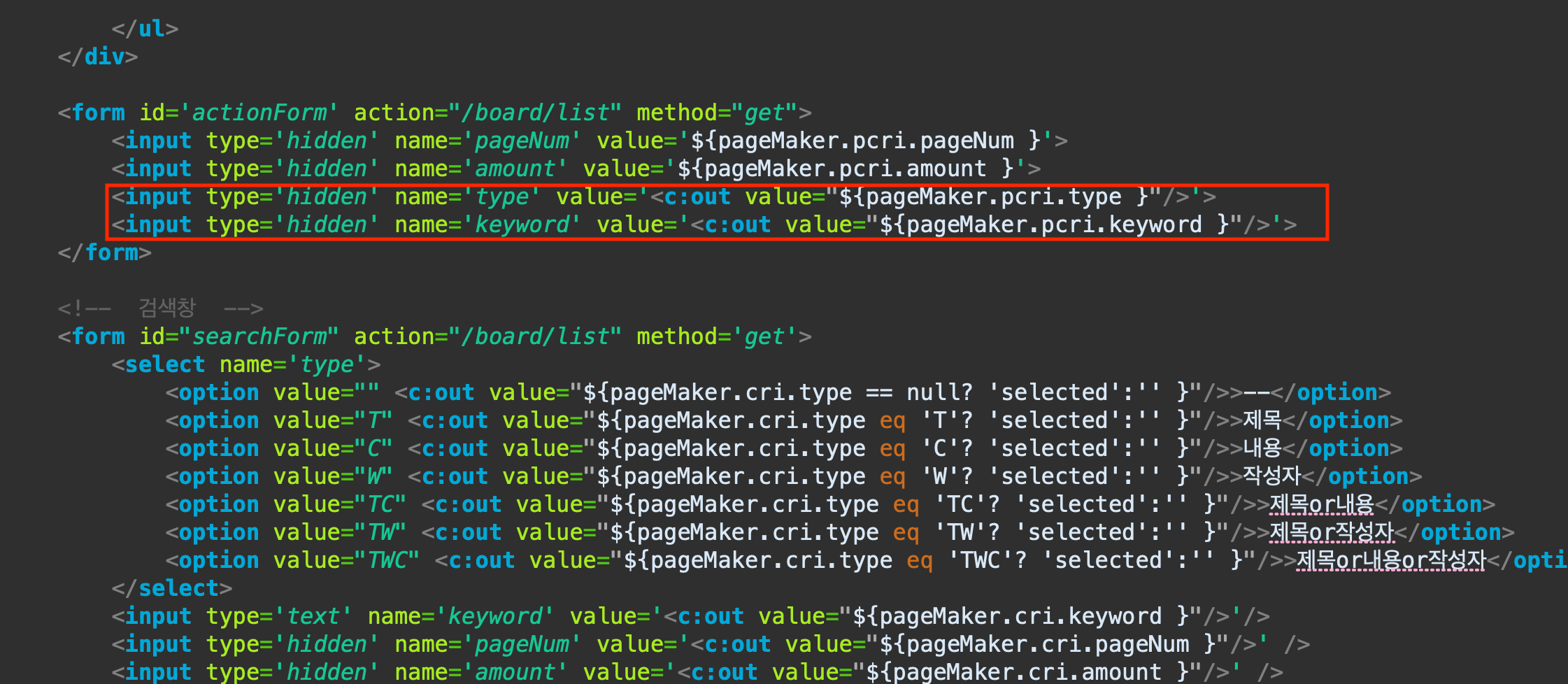 검색할조건 type과 검색할 키워드 keyword 를 변수로 만든다