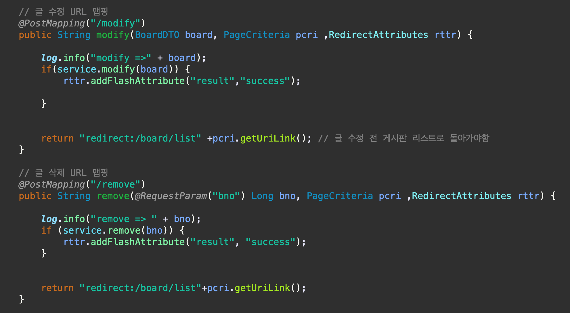 동작 후 redirect: 로 이동함으로 boardController에도 추가해줘야한다