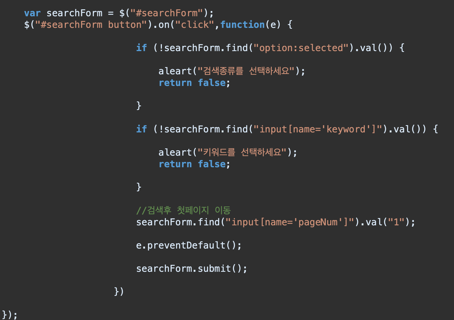 검색조건과 키워드를 입력하지 않은채 검색버튼을 눌렀을때 경고창이 뜨도록 설정한다