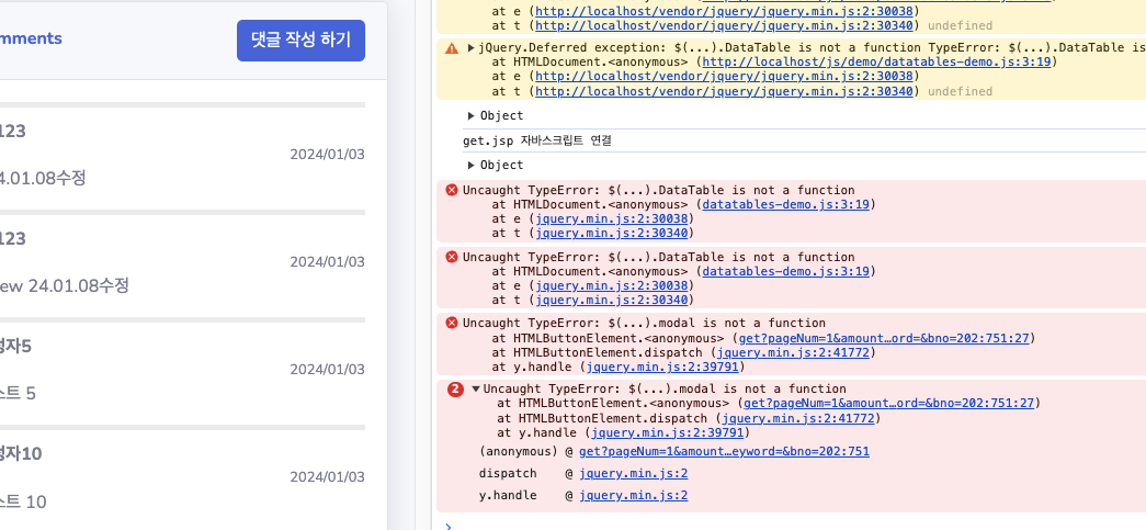🌈 프로젝트/오류해결 오류_모달창 Uncaught TypeError: $(...).modal is not a function 소소한 알마 2024. 1. 10. 12:03 반응형 SMALL [상황] 모달창이 안열림 [해결] js 연결이 뭔가 어긋남 다시 정리하여 수정하니 모달창이 뜸 반응형 LIST 공유하기 게시글 관리 알마 블로그 저작자표시 비영리 변경금지 (새창열림) '🌈 프로젝트 > 오류해결' 카테고리의 다른 글 오류_페이지 색인 생성 오류 (28) 2024.10.08 프로젝트 공부중 궁금한것 해결 (12) 2023.12.31 오류_http://java.sun.com/jsp/jstl/core 빨간줄 (102) 2023.11.28 오류_심각: Context initialization failed org.springframework.beans.factory.parsing.BeanDefinitionParsingException: Configuration problem: Unable to locate Spring NamespaceHandler for XML schema namespace [http://www.springframework.org/schema/tx] Of.. (30) 2023.11.26 오류_프로덕션 환경들에서 최적의 성능을 제공하는, APR 기반 Apache Tomcat Native 라이브러리가, 다음 java.library.path에서 발견되지 않습니다: [/Users/min/Library/Java/Extensions:/Library/Java/Extensions:/Network/Lib.. (8) 2023.11.26 '🌈 프로젝트/오류해결' Related Articles 오류_페이지 색인 생성 오류 프로젝트 공부중 궁금한것 해결 오류_http://java.sun.com/jsp/jstl/core 빨간줄 오류_심각: Context initialization failed org.springframework.beans.factory.parsing.BeanDefinitionParsingException: Configuration problem: Unable to locate Spring NamespaceHandler for XML schema namespace [http://www.springframework.org/schema/tx] Of..
